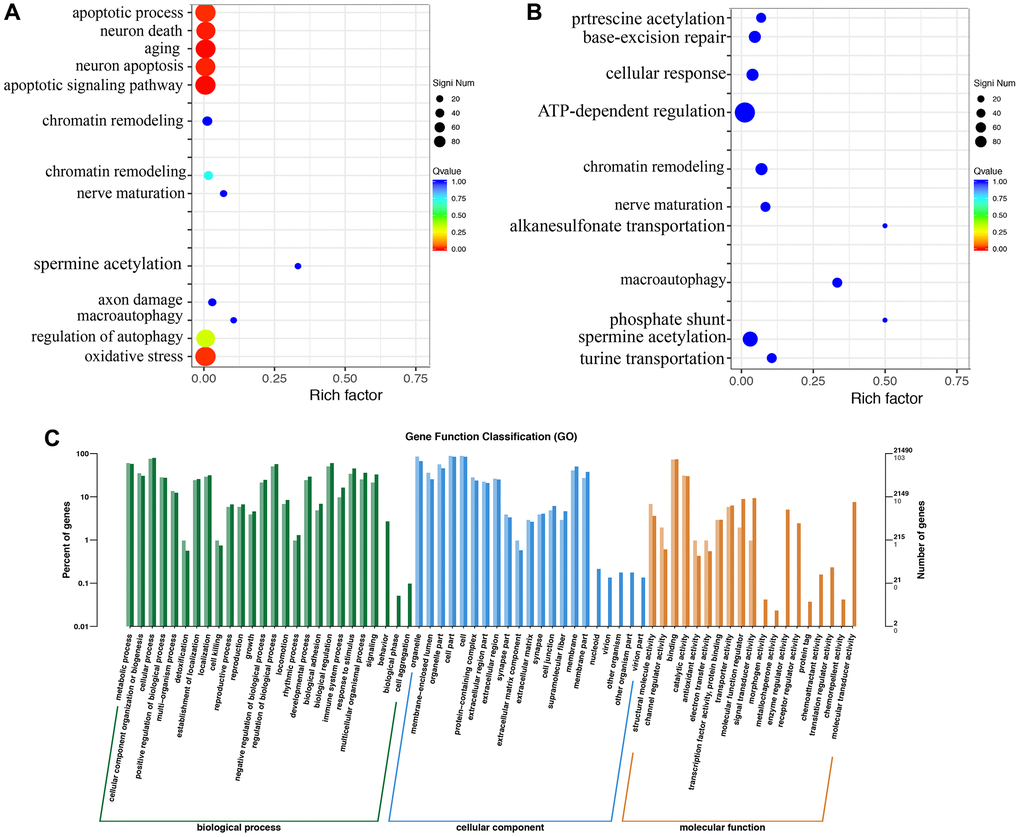 The gene ontology enrichment analysis indicated that MCAO treatment might affect the apoptotic process, neuron death, aging, and oxidative stress (Figure 5A). However, Dex treatment changed the influence of MCAO (Figure 5B). The gene ontology analysis includes molecular function, cellular component and biological process (Figure 5C).