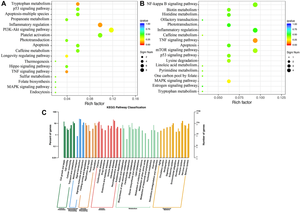 The KEGG pathway enrichment analysis suggested that inflammatory regulation, PI3K-Akt signaling pathway, apoptosis, and TNF signaling pathway are the most critical pathways involved in MCAO rats (Figure 6A). Compared to group MCAO, differential signaling pathway influenced by Dex were mainly associated TNF signaling pathway, inflammatory regulation, mTOR signaling pathway, and NF-kappa B signaling pathway (Figure 6B). In addition, the KEGG pathway classification was presented (Figure 6C).