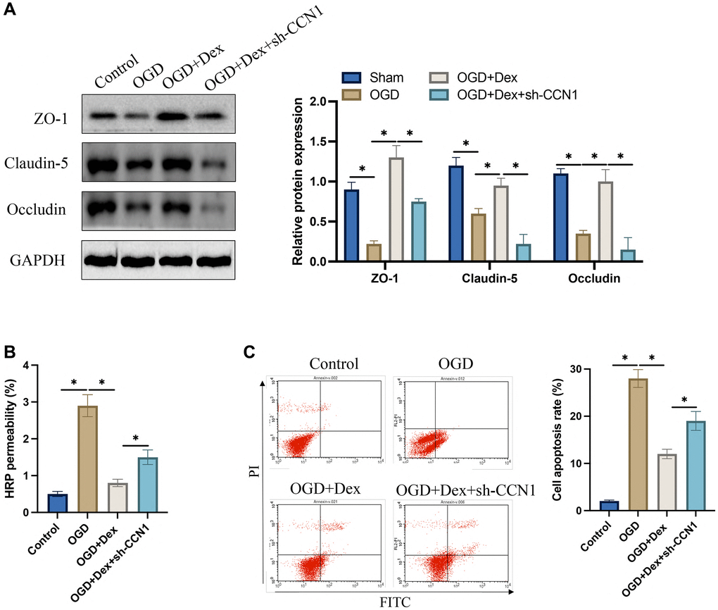 The protein expression of Occludin, Claudin-5, and ZO-1 was markedly suppressed after OGD induction. After treatment with Dex, the expression of tight junction protein in cells were greatly elevated, but sh-CCN1 reversed the influence of Dex (Figure 7A). The increase of HRP permeability induced by OGD was significantly inhibited by Dex (Figure 7B), but the decreased HRP permeability was increased after simultaneous transfection with sh-CCN1. In addition, we found that transfection with sh-CCN1 could increase the decreased apoptosis caused by Dex (Figure 7C).