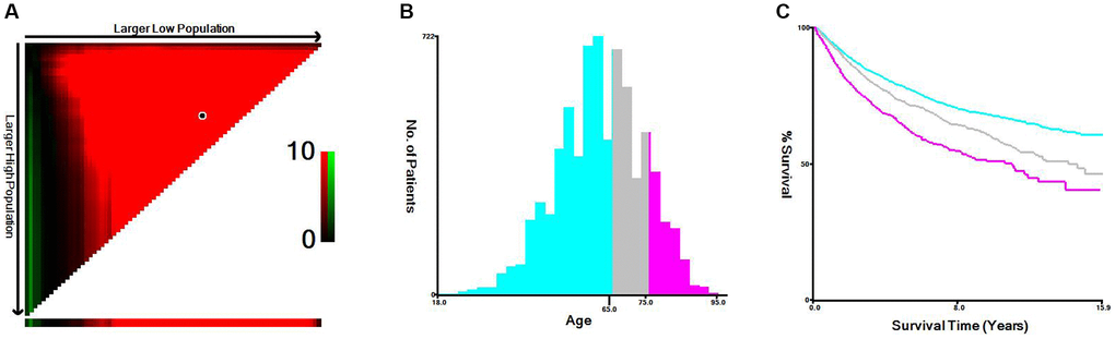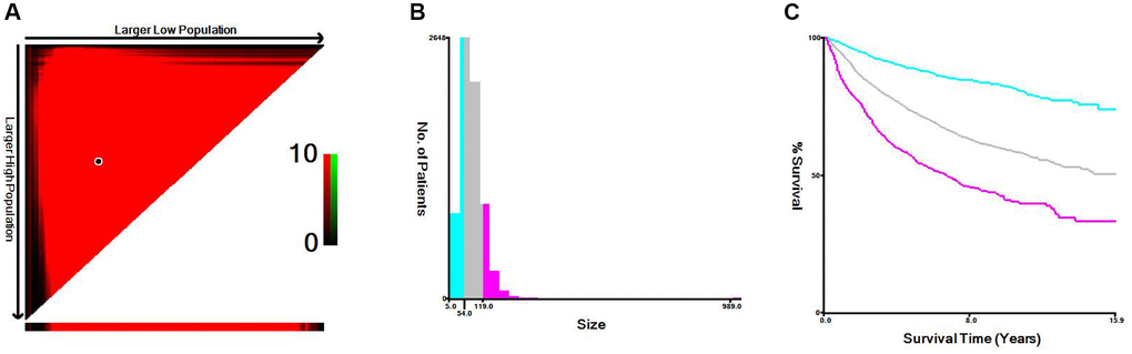 A computer program was used to evaluate age and tumor size threshold points for patients through information about their age, tumor size, and CSS input to the X-tile software. The threshold of age was 65 years old and 75 years old, which could be divided into 3 groups: “≤65 years old”, “66–75 years old” and “>75 years old” (Figure 1). The threshold of tumor size was 54 mm and 119 mm, which could be divided into 3 groups: “<55 mm”, “55–119 mm”, and” >120 mm” (Figure 2). The data indicated that age and tumor size were strongly correlated with the prognosis of locally advanced RCC, and patients with “tumor size <54 mm” and “age ≤65 years old” had improved prognosis, and “tumor size >120 mm” and age larger than 75 years old are a negative factor that suggests a poorer prognosis.