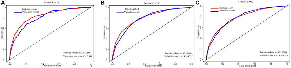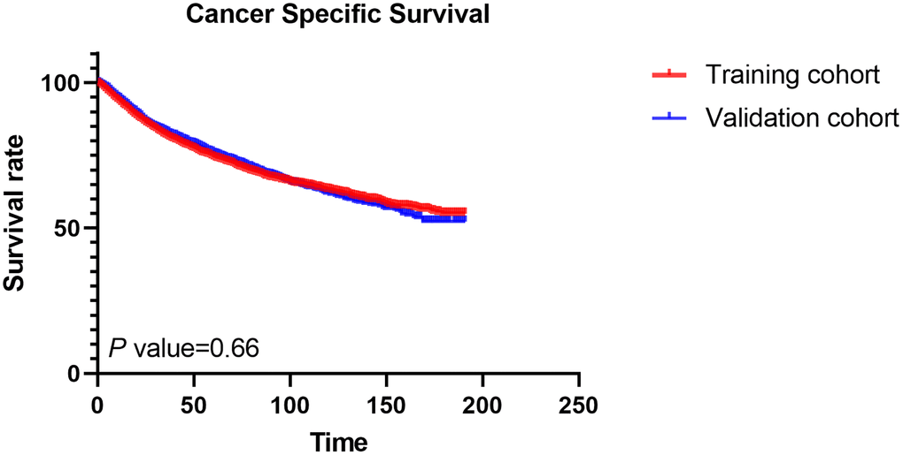 This study included 10,080 patients diagnosed with locally advanced RCC who met the pre-defined inclusion and exclusion criteria. A random allocation was performed, distributing 7,056 patients to the training set and 3,024 patients to the validation set. Detailed descriptive and clinical features of these patient cohorts are outlined in Table 1. Most patients were man, white, and aged ≤65 years old. CcRCC was the most common histologic type, and most tumors were between 56 and 119 mm in size. Poor differentiated tumors account for the majority of tumors and very few well-differentiated tumors. The majority of tumors were T3a and N0. Regarding treatment, most patients underwent radical nephrectomy, without surgery of lymph nodes, radiotherapy, or chemotherapy. In the training and validation sets, the 1-, 3-, and 5-year CSS rates are 93.55%, 84.64%, 79.59%, and 94.78%, 85.91%, 80.02%, respectively (P = 0.660, Figure 3).