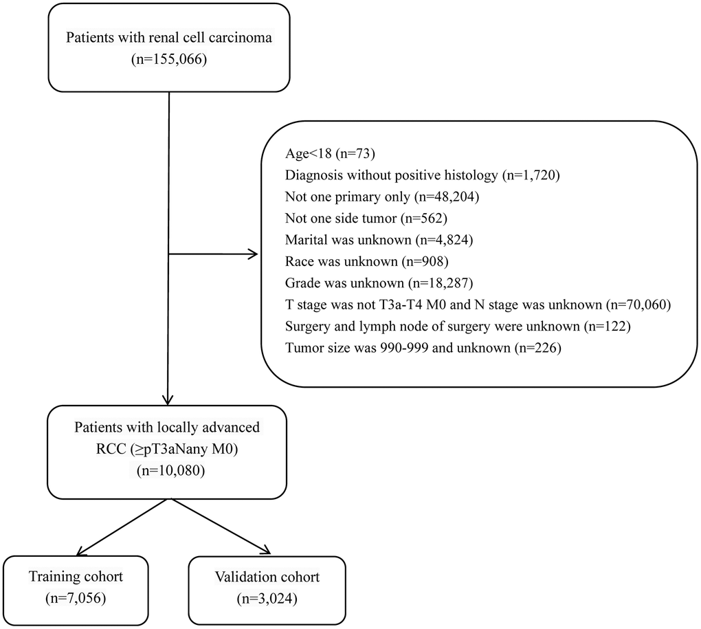 The inclusion criteria for this study were as follows: (1) patients who were diagnosed with locally advanced RCC (≥pT3a Nany M0). (2) age ≥18 years. (3) unilateral primary RCC. (4) individuals who had a complete record of cancer-specific survival months. (5) positive histologically confirmed diagnosis with histology codes 8260/3, 8310/3, 8316/3, 8317 /3, 8318/3, 8319/3, 8323/3, 8510/3 and (6) individuals with only one primary tumor. Exclusion criteria included the following: (1) patients who had unknown information regarding their age, race, marriage, tumor size, histological type, grade, surgery, T-stage, N-stage, M- stage, radiotherapy, etc. (2) individuals lacking full follow-up. Since the histological type was mostly ccRCC, the subhistological subtypes were divided into ccRCC and nccRCC. The flowchart of localized advanced RCC (≥pT3a Nany M0) case extraction from the SEER database was presented in Figure 7.