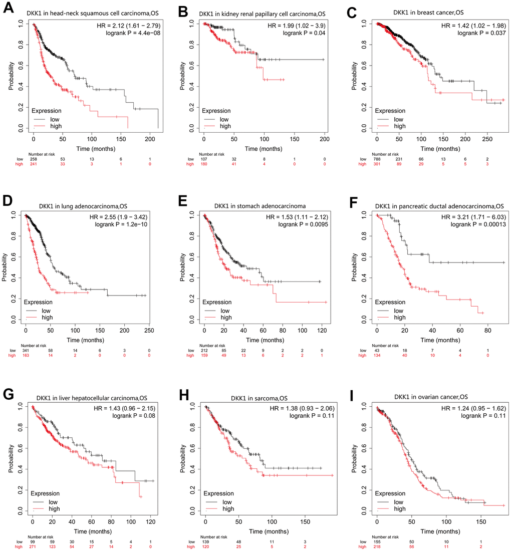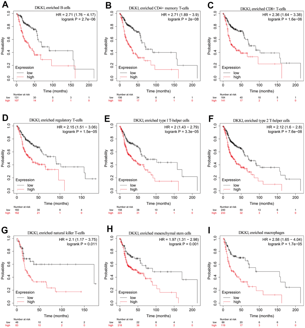 Prognostic analysis was performed using the KM plotter (http://kmplot.com/analysis/) [41]. The DKK1-expression levels in several tumor types were correlated with clinical outcomes using the KM plotter database. Based on the DKK1 expression levels in the corresponding immune cell subgroups, we performed prognostic analysis using the KM website. We calculated the HRs for the log-rank p-values and 95% confidence intervals (CIs).