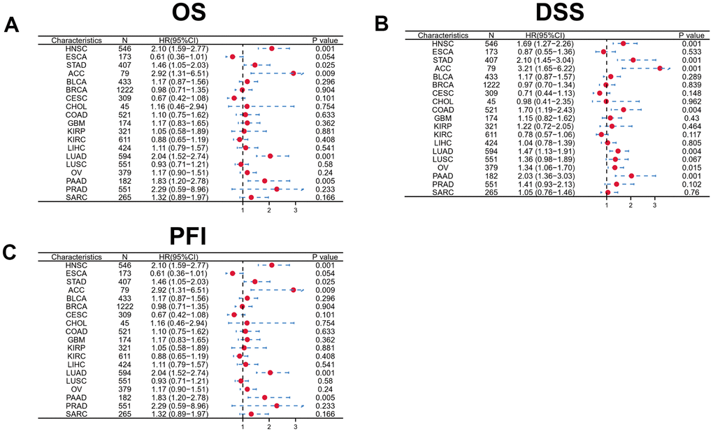 To determine the prognostic significance of DKK1 expression in human malignancies, we searched the Kaplan–Meier (KM) plotter database. Patients with HNSCC, LUAD, BRCA, KIRP, pancreatic ductal adenocarcinoma (PAAD), LIHC, and STAD who had high DKK1 levels had shorter survival times (Figure 2A–2G). In contrast, patients with sarcoma and ovarian cancer who expressed high levels of DKK1 showed little effect on their OS (Figure 2H, 2I). Analyzing OS values obtained using the KM Plotter, we applied the “survival” and “ggplot2” packages in R software to assess multiple clinical prognostic markers associated with DKK1 expression across various malignancies. In patients with HNSCC, STAD, ACC, LUAD, or PADD, a forest plot demonstrated that elevated DKK1 expression was a risk factor for unfavorable OS, progression-free interval (PFI), and disease-specific survival (DSS) (Figure 3A–3C). These results indicate that patients with HNSCC have poor prognosis when their DKK1 expression is upregulated.