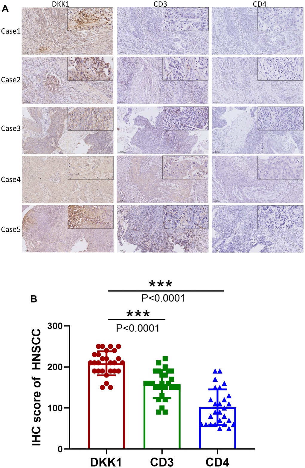 Four-micrometer-thick, 4%formalin-fixed, paraffin-embedded tissue sections of 27 head and neck tumor tissues, including nasopharyngeal carcinoma (n = 10), tongue carcinoma (n = 7), laryngeal carcinoma (n = 7), other forms of head and neck carcinoma (n = 3), and normal tissues (n = 15), were subjected to the previously mentioned techniques for dewaxing and rehydration [43]. Antigen retrieval was performed in a microwave oven for 8 min with EDTA Antigen Retrieval Solution (50X) (Beyotime, P0085) at pH 9.0. The slides were immersed in a solution of 3% hydrogen peroxide, incubated in the dark for 25 min at ambient temperature, submerged in phosphate-buffered saline (pH 7.4), and rinsed thrice with shaking on a destaining shaker (5 min per wash). Subsequently, the slides were subjected to overnight incubation at 4° C with primary rabbit polyclonal antibodies against 1:200, 1:1000, and 1:200 dilutions of DKK1 (Proteintech; 21112-1-AP), CD3 (Proteintech; 17617-1-AP), or CD4 (Abeam; ab133616), respectively. Next, we used the 2-Sstep Plus® Polyhorseradish Peroxidase (HRP) Anti-goat/Rabbit Immunoglobulin G [IgG] Detection System (Abcam, Ab6721), as per the recommendations provided by the manufacturer. Color development and comparisons were performed using a DAB Kit (Solarbio; DA1010) and hematoxylin, respectively.