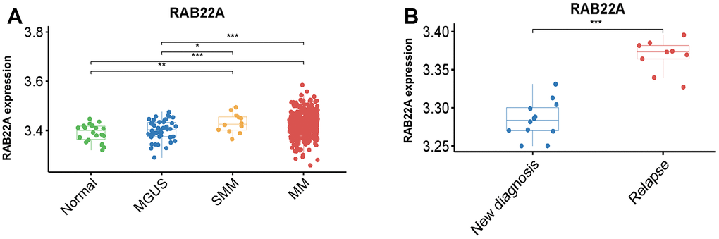 Firstly, we explored the expression level of RAB22A in normal people, MGUS, SMM and MM patients, and found that the expression level of RAB22A in SMM and MM patients was significantly higher than that in normal people and MGUS patients (Figure 1A). In order to further clarify the prognostic role of RAB22A in MM, we analyzed the expression level of RAB22A in newly diagnosed and relapsed MM patients. The results showed that the expression level of RAB22A in relapsed MM patients was significantly higher than that in newly diagnosed MM patients (Figure 1B). These results showed the prognostic value of RAB22A for MM patients, which urged us to further explore the biological function of RAB22A.