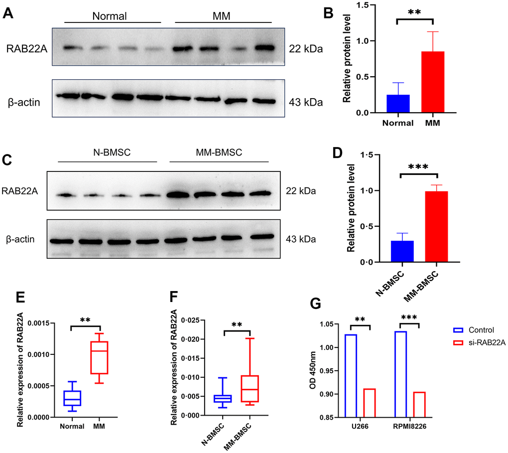 We collected the clinical information of 71 normal controls and 30 newly diagnosed MM patients. After 1: 1 propensity score matching (PSM) was performed to eliminate the bias caused by sex and age, 25 normal controls and 25 newly diagnosed MM patients were included for follow-up analysis (Supplementary Table 4). We used western blot and qRT-PCR to verify the difference in the expression level of RAB22A. The results showed that the expression level of RAB22A in MM was significantly higher than that in normal people (Figure 10A, 10B, 10E), and the expression level in MM-BMSC was significantly higher than that in Normal-BMSC (N-BMSC) (Figure 10C, 10D, 10F). Then, we down-regulated RAB22A expression in U266, RPMI 8226 cell lines and MM-MSCs by lentivirus transfection. After down-regulating RAB22A in MM cell line, the cell proliferation was significantly decreased (Figure 10G). We extracted the exosomes of MSCs from the control group and the si-RAB22A group, identified them by exosome markers (Figure 11A), and co-cultured the exosomes from MSCs with MM cell lines. Immunofluorescence staining results showed that the secretion of exosomes decreased after inhibiting the expression of RAB22A in MSCs (Figure 11C). The results of CCK-8 assay showed that compared with the exosomes of MSCs that down-regulated RAB22A, the exosomes of MSCs in control group significantly promoted the proliferation of MM cells (Figure 11B).