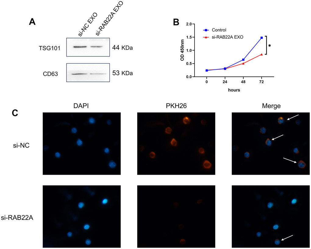 Cells were inoculated into a 96-well plate, and exosomes filtered with a 0.22um filter were added. Cell Counting Kit-8 (CCK-8) was added at different time points and incubated at 37° C for 2 hours. The absorbance at 450nm was measured by spectrophotometer.
