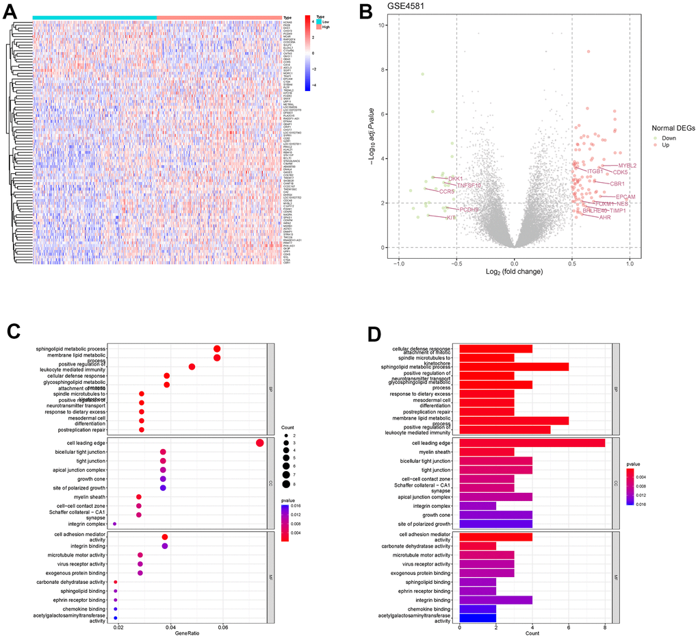 We extracted the RAB22A expression level of 414 newly diagnosed MM patients with GSE4581 by using the “limma” package, and divided the samples into high RAB22A expression group and low RAB22A expression group according to the median value. The heatmap and volcano plot showed the DEGs in the high and low RAB22A expression groups. Gene Ontology (GO) enrichment analysis and Kyoto encyclopedia of genes and genomes (KEGG) enrichment analysis were carried out to further explore the potential biological functions.