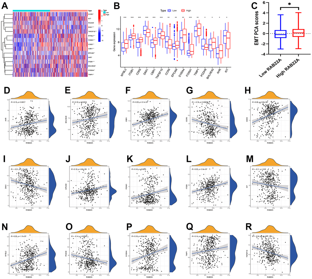 We obtained the DEGs in the high and low RAB22A expression groups, and intersected them with the EMT gene set to obtain 15 EMT genes related to RAB22A. We showed the EMT genes expression levels (Figure 3A, 3B) among different RAB22A expression groups by using heatmap and boxplot. The results showed that the expression levels of MYBL2, ITGB1, CDK5, CBR1, EPCAM, S100A4, FOXM1, TIMP1, BHLHE40 and AHR in high RAB22A expression group were higher than those in low RAB22A expression group, while the expression levels of DKK1, TNFSF10, CCR5, PCDH9 and KIT in high RAB22A expression group were lower. In addition, we drew scatterplots of the correlation between RAB22A and EMT genes (Figure 3D–3R). Finally, we calculated the EMT scores of different RAB22A groups through the “IOBR” package, and the results showed that the EMT scores of high RAB22A expression group were significantly higher than those of low RAB22A expression group (Figure 3C).