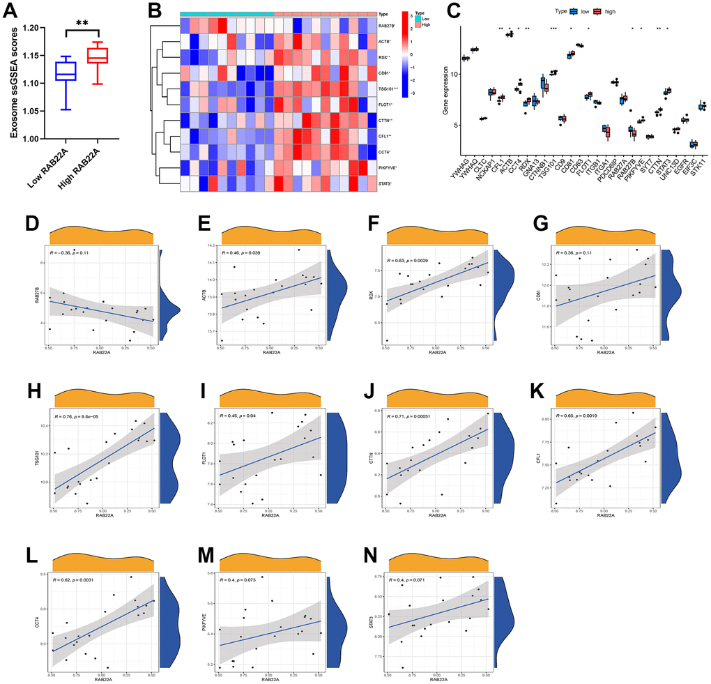 We extracted the expression data of MSCs from 12 newly diagnosed MM patients and 9 relapsed MM patients in GSE146649 dataset, and calculated the exosome scores with “ssGSEA” algorithm. The results showed that the exosome scores of MSC in relapsed patients was significantly higher than that in newly diagnosed patients (Figure 4A). Then, we further analyzed the expression levels of exosome-related genes in newly diagnosed and relapsed patients. The results showed that the expression levels of CFL1, ACTB, CCT4, RDX, TSG101, FLOT1, CTTN, and STAT3 in relapsed patients were significantly higher than those in newly diagnosed patients (Figure 4B, 4C). In order to further clarify the effect of RAB22A on exosomes secretion, we extracted the expression data of RAB22A from newly diagnosed and relapsed patients, and divided the samples into high and low RAB22A expression groups according to the median value. The results showed that the exosome scores of high RAB22A expression group was significantly higher than that of low RAB22A expression group (Figure 5A). Heatmap and boxplot showed that the expression levels of exosome-related genes in high RAB22A expression group and low RAB22A expression group. The results showed that the expression levels of CFL1, ACTB, CCT4, RDX, TSG101, CD81, FLOT1, PIKFYVE, CTTN and STAT3 in high RAB22A expression group were significantly higher than those in low RAB22A expression group (Figure 5B, 5C). Finally, we showed the correlation between the expression level of RAB22A and exosome genes by scatterplots (Figure 5D–5N).