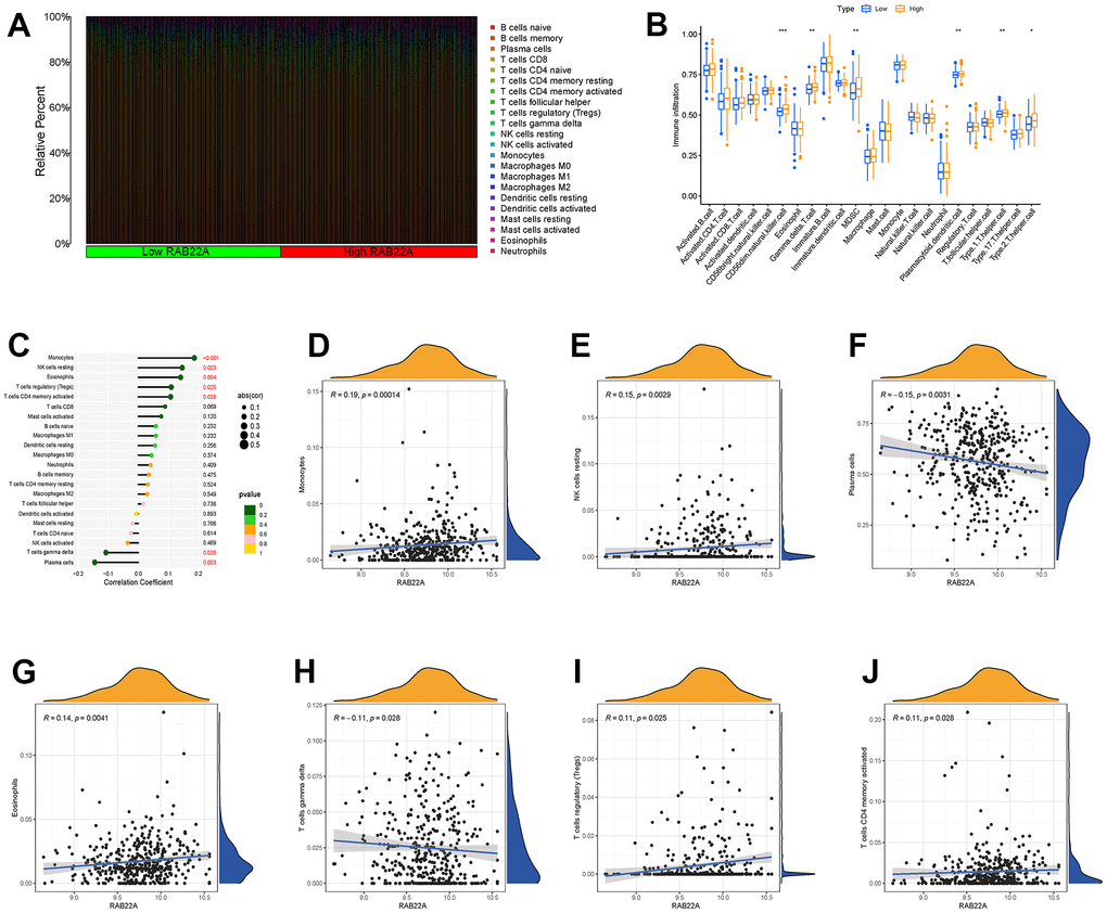 We used the “CIBERSORT” package for immune cell infiltration analysis. The degree of immune cell infiltration in high and low RAB22A expression groups was analyzed, and the “ggplot2” and “ggpubr” packages were used to draw borplot and barplot. In addition, we further drew scatterplots between the expression level of RAB22A and the infiltration level of immune cells.