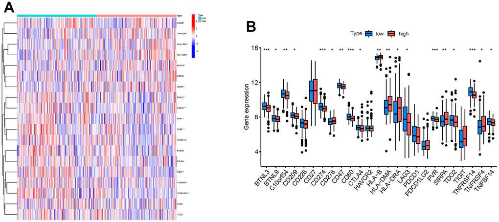 In addition, we selected 25 immune checkpoint genes and analyzed the expression levels of these genes in high and low RAB22A expression groups. The results showed that the expression levels of BTNL3, BTNL9, C10orf54, CD209, CD274, CD47, CD80, CTLA4, LAG3, PVR, TDO2, TNFRSF14 and TNFSF14 in the high RAB22A group were lower than those in the low RAB22A group, while CD276, HLA-B, HLA-DMA, HLA-DRA, SIRPA and TNFRSF4 were higher in the high RAB22A group (Figure 7A, 7B).
