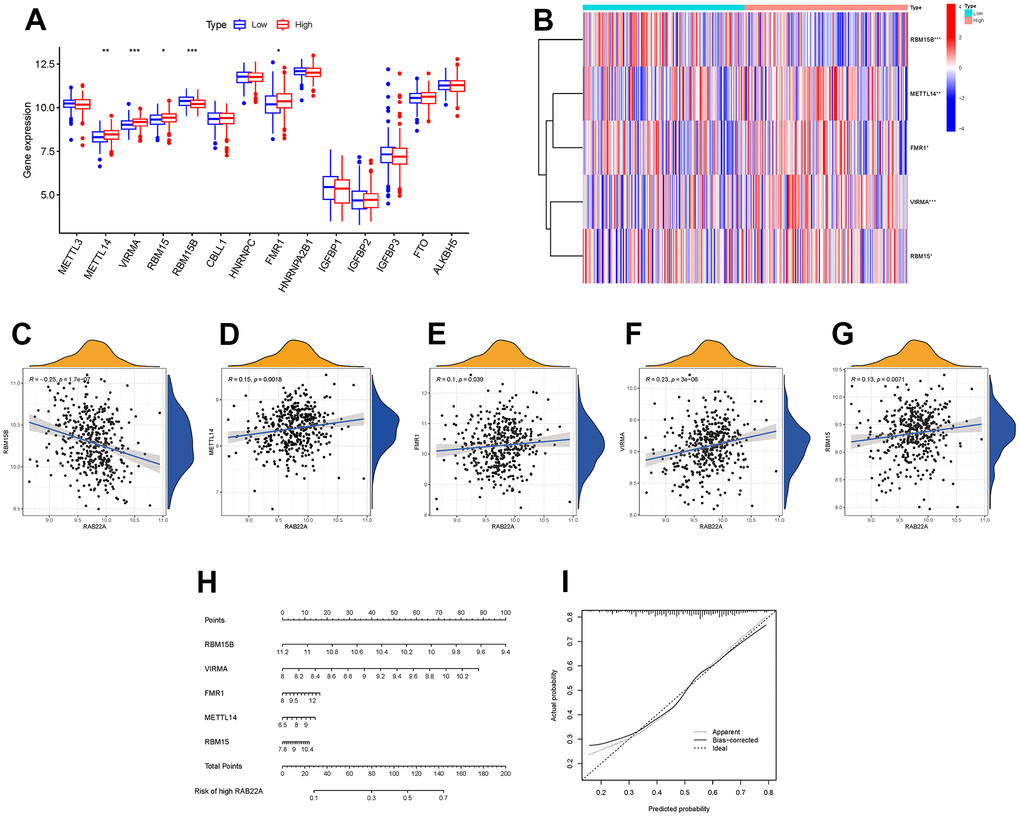 M6A RNA methylation is the most common internal modification in mammalian mRNA, which plays a key biological role by regulating important cellular processes, especially in cancer, where the modification disorder of m6A methylation is often observed. We analyzed the expression levels of m6A-related genes in different RAB22A expression groups. The results showed that the expression levels of METTL14, VIRMA, RBM15 and FMR1 in high RAB22A expression group were significantly higher than those in low RAB22A expression group (Figure 8A, 8B), and the scatterplots showed that these genes were positively correlated with RAB22A (Figure 8C–8G). In addition, we constructed a nomogram (Figure 8H) based on the m6A methylation genes significantly related to RAB22A, which was used to predict the risk value of overexpression of RAB22A. The calibration curve showed that the nomogram had good predictive ability (Figure 8I).