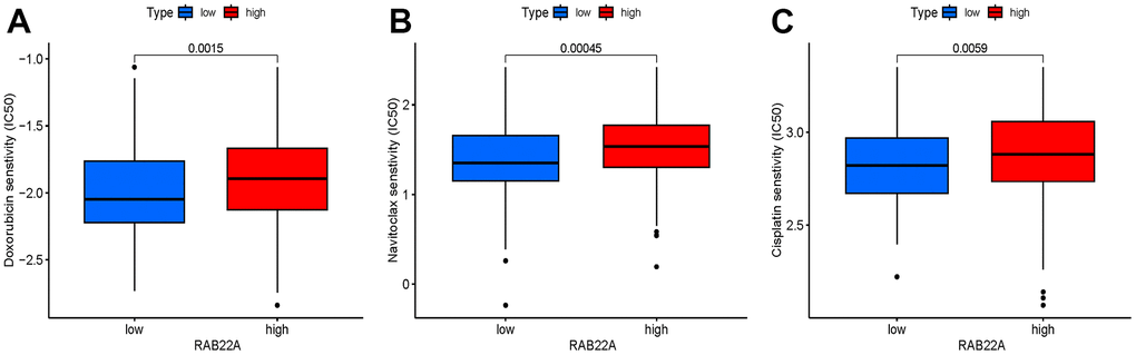 We screened sensitive drugs according to the difference of half maximum inhibition concentration (IC50) between high and low RAB22A expression groups. After consulting the literature, we focused on the drugs that have been used or have prospects in MM. It was worth noting that the IC50 values of doxorubicin, bcl-2 inhibitor (Navitoclax) and cisplatin in low RAB22A expression group were significantly lower than those in high RAB22A expression group (Figure 9A–9C).