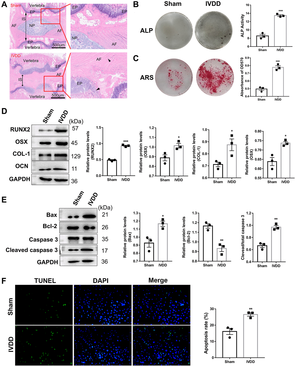 We evaluated the histological structure of the IVD after H&E staining to confirm the IVDD rat model was successfully established (Figure 1A). The histological structure of Co6-7 in the IVDD group displayed inflammatory cell infiltration, gelatinous NP structure disorder in AF, and even narrowing of intervertebral space (IS) between endplate (EP) compared with the sham group. Calcification of the IVD tissues was highly correlated with IVDD progression. After successfully isolating AFs from the Co6-7 of the sham and IVDD rat models, the AF ostenogenic differentiation ability was investigated by ALP and Alizarin red staining (ARS) assays. The ALP activity was elevated in IVDD-derived AFs (Figure 1B), and the matrix mineralization level was significantly increased (Figure 1C). In addition, western blotting (WB) analysis demonstrated that osteogenic differentiation-related markers, including RUNX2, OSX, COL-1, and OCN were highly expressed in AFs from IVDD rats compared with those from sham group (Figure 1D). These data suggested that IVDD group AF have stronger potential for differentiating into osteoblasts compared with those of the sham group, which indirectly confirmed that the IVDD rat model was successfully established. Moreover, compared with the sham group, the expression levels of pro-apoptosis proteins (bax and cleaved caspase-3) of AFs were considerably elevated in the IVDD group, as opposed to the anti-apoptosis protein, bcl-2, which was significantly reduced (Figure 1E). This indicated that IVDD AF cells underwent excessive apoptosis, which was confirmed by TUNEL staining (Figure 1F). Taken together, these data demonstrated that AFs were successfully isolated from the sham and IVDD rat models.