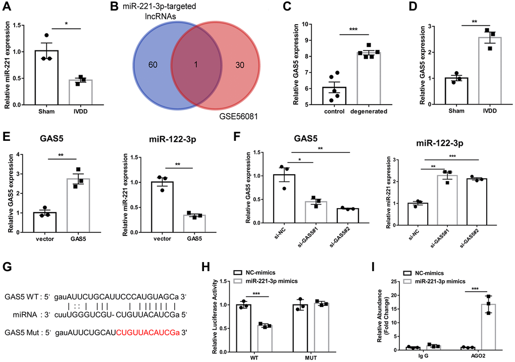 MiR-221-3p has been proven to be lowly expressed in IVDD-derived AFs [11], which was consistent with the results of the present study (Figure 2A). To obtain the potential target lncRNA of miR-221-3p in IVDD, we identified 31 upregulated lncRNA in IVDD based on the GSE56081 dataset (Supplementary Table 1). We intersected them with 61 potential target lncRNAs of miR-221-3p predicted by ENCORI (Supplementary Table 2). The Venn diagram displayed that only a common lncRNA, GAS5, was obtained after intersection (Figure 2B). In the GSE56081 dataset, GAS5 expression in degenerated disks was significantly higher than in normal disks (Figure 2C). Similarly, GAS5 expression of AFs from the IVDD group was also significantly higher than that in the sham group (Figure 2D). Consequently, GAS5 overexpression was found to significantly inhibit miR-221-3p expression of AFs (Figure 2E). At the same time, silencing of GAS5 could promote the expression of miR-221-3p in AFs (Figure 2F). After predicting the potential binding site between GAS5 and miR-221-3p (Figure 2G), dual-luciferase reporter assay revealed that miR-221-3p mimic considerably reduced the luciferase activity of a reporter gene with wild-type (WT). This finding was not observed with mutant (MUT) GAS5 3′-UTR (Figure 2H). AGO2-RIP assay further demonstrated that GAS5 was efficiently enriched in anti-AGO2 complexes in AFs (Figure 2I). These findings suggested that lncRNA GAS5 was highly expressed in IVDD and could downregulate miR-221-3p expression in AF cells.