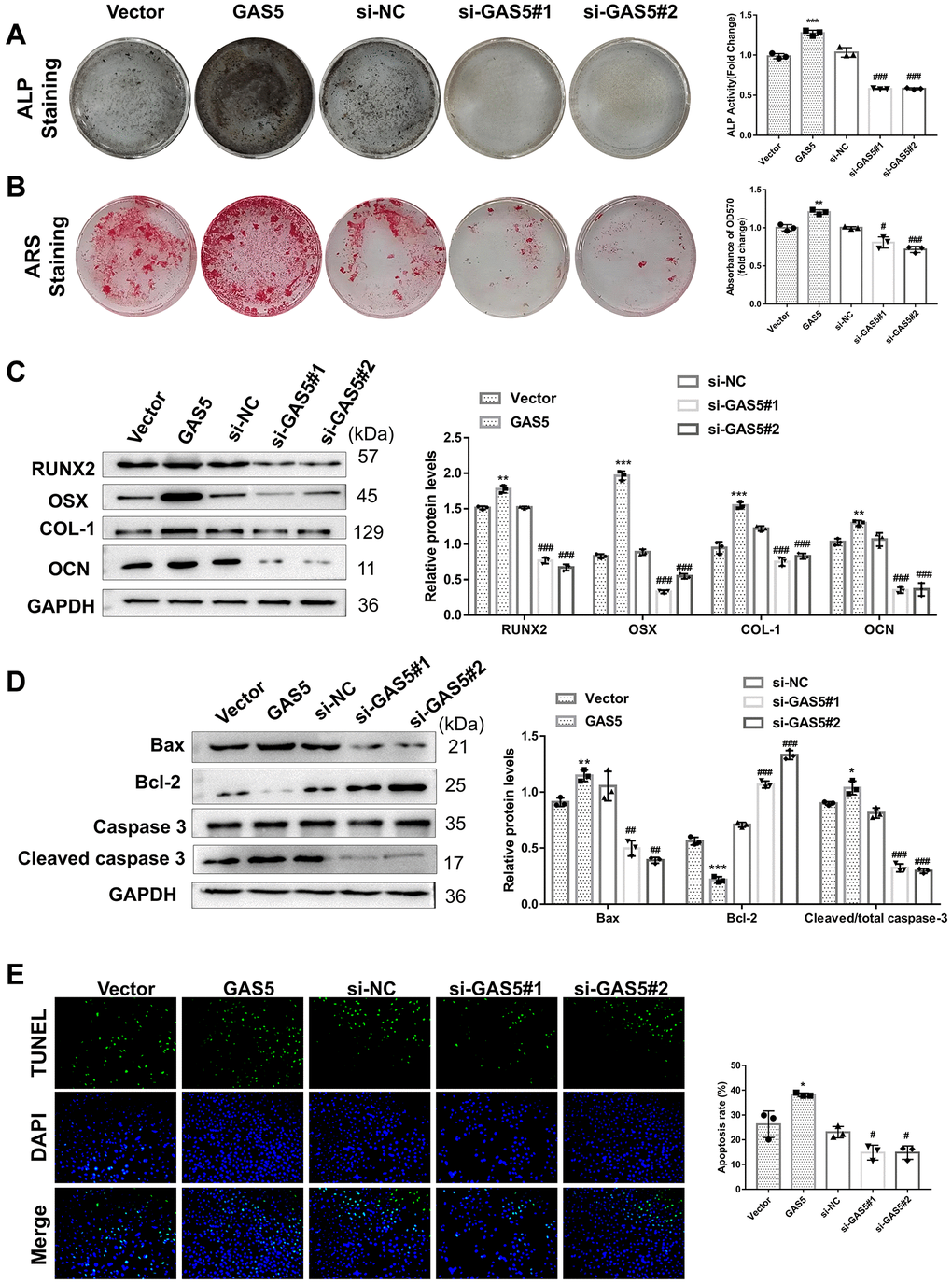 To evaluate the functional effect of GAS5 on AFs, GAS5 was overexpressed or knocked down in AFs. Although GAS5 overexpression significantly promoted the expression of osteogenic differentiation-related proteins (RUNX2, OSX, COL-1, and OCN) in AFs, the opposite effect was observed fromGAS5 silencing (Figure 3A). Upon osteogenic induction, GAS5 overexpression significantly increased tALP activity (Figure 3B) and AF matrix mineralization (Figure 3C), which were reduced when silencing GAS5. These results collectively revealed the promotive role of GAS5 in AF osteogenic differentiation. Meanwhile, GAS5 overexpression led to a significant increase in the expression of pro-apoptosis proteins and a decrease in the anti-apoptosis protein expression in AFs (Figure 3D), suggesting that GAS5 contributed to the apoptosis of AFs. The TUNEL staining assay exhibited a similar tendency, showing that the number of TUNEL-positive AFs was significantly increased after overexpressing GAS5 and decreased after knocking down GAS5 (Figure 3E). The above findings indicated that GAS5 contributed significantly to osteogenic differentiation and apoptosis in AFs.