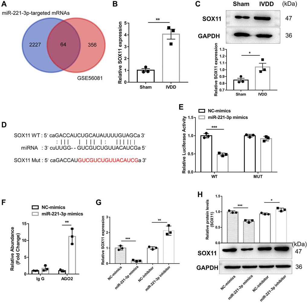 Then, we explored the downstream RNA of miR-221-3p to uncover its ceRNA axis further in the osteogenic differentiation and apoptosis in AFs. To obtain the potential target mRNA of miR-221-3p in IVDD, we identified 420 upregulated mRNAs in IVDD based on the GSE56081 dataset (Supplementary Table 3) and merged them with 2291 potential target mRNAs of miR-221-3p predicted by ENCORI (Supplementary Table 4). Sixty-four common mRNAs were obtained after intersection (Supplementary Table 5) (Figure 4A). Since the osteogenic differentiation potential was highly correlated with AF stemness, SOX11, a mesenchymal stem cell characteristic gene [21], was selected. Our findings showed that SOX11 was highly expressed by mRNA and protein in IVDD-derived Afs (Figure 4B, 4C). ENCROEI predicted the binding sites between miR-221-3p, and SOX11 (Figure 4D). Dual-luciferase reporter assay illustrated that miR-221-3p decreased luciferase activity in SOX11-WT plasmid transfected cells (p < 0.01), as opposed to no change observed in cells transfected with SOX11-MUT plasmid (Figure 4E), confirming a direct interaction between miR-221-3p and SOX11. The AGO2-RIP assay demonstrated that miR-221-3p was efficiently enriched in anti-AGO2 complexes in Afs compared with the anti-IgG group (Figure 4F). Furthermore, miR-221-3p overexpression could significantly suppress SOX11 expression. In contrast, the opposite effect was noted when silencing miR-221-3p (Figure 4G, 4H). Further, the biological experiments revealed that miR-221-3p overexpression could significantly suppress the AF osteogenic differentiation (Supplementary Figure 2A–2C) and apoptosis (Supplementary Figure 2D, 2E), while these effects were rescued by SOX11 overexpression. MiR-221-3p could directly inhibit SOX11 expression to regulate apoptosis and osteogenic differentiation in AFs.