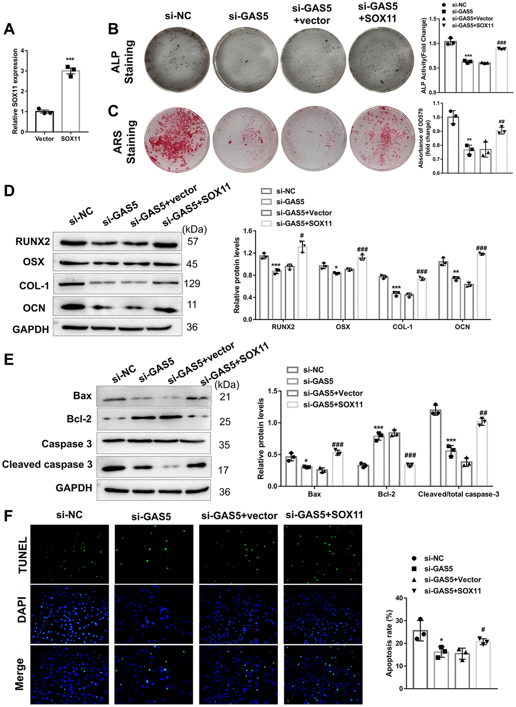 To explore whether GAS5 regulates the apoptosis and osteogenic differentiation of AFs in a SOX11-dependent manner, AFs were transfected with or without si-GAS5 plasmid (either alone or with SOX11 overexpression plasmid). Our results showed that the SOX11 overexpression plasmid could successfully overexpress SOX11 in AFs (Figure 5A). As expected, the previously inhibited ALP activity (Figure 5B) and matrix mineralization level (Figure 5C) by si-GAS5 transfection were partly rescued by SOX11 overexpression in AFs, indicating that SOX11 mediated the role of GAS5 in the osteogenic differentiation of AFs. In addition, suppression of osteogenic differentiation-related proteins (RUNX2, OSX, COL-1, and OCN) in GAS silencing AFs was significantly restored by SOX11 overexpression (Figure 5D). Concerning the apoptosis of AFs, SOX11 overexpression also restrained the effect of GAS silencing, as evidenced by the WB and TUNEL assay. SOX11 overexpression in GAS5-silenced AFs was found to elevate pro-apoptosis proteins’ expression levels, decrease anti-apoptosis proteins’ expression, and increase TUNEL-positive cells (Figure 5E, 5F). These findings suggested that GAS5 contributes to the apoptosis and osteogenic differentiation of AFs in IVDD via the miR-221-3p/SOX11 axis.