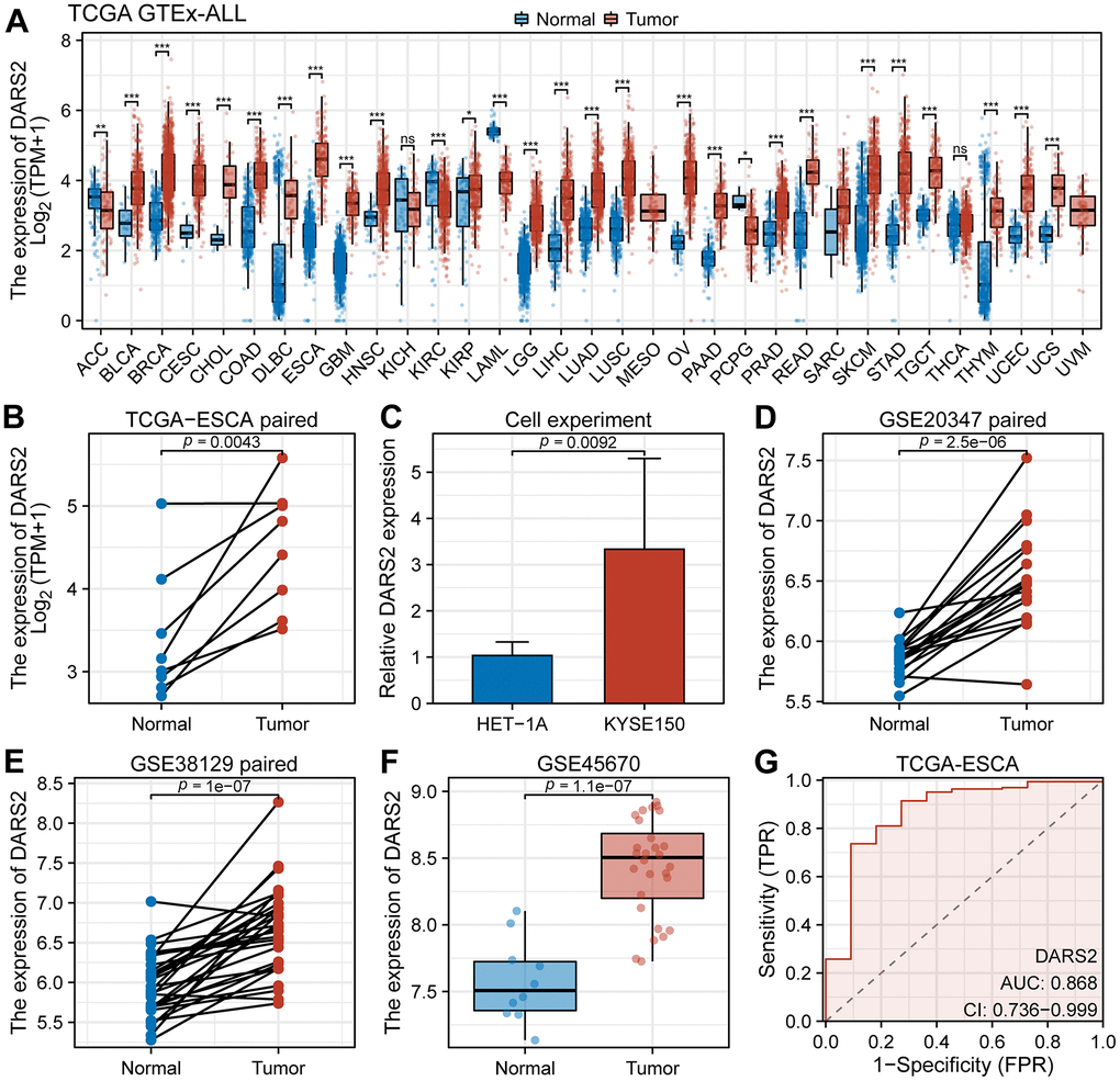 In this study, the comprehensive application of bioinformatics analysis enabled the prediction of DARS2 expression in tumors, while the regulatory capacity of DARS2 in ESCA tumor cells was successfully validated via cellular assays. Through analysis of the TCGA database, we found that DARS2 was significantly higher in esophageal cancer samples than in the control group. This finding implies that DARS2 could potentially be a therapeutic target for esophageal cancer, providing a basis for further investigational studies.