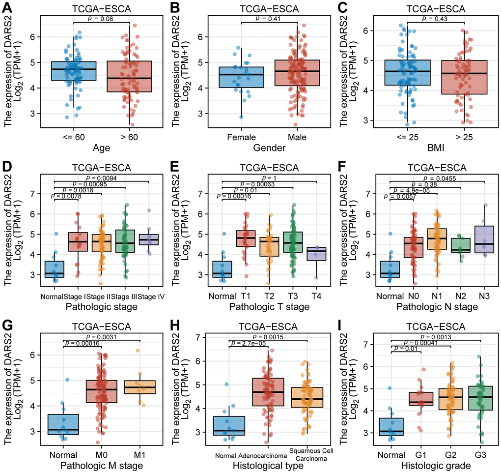In the TCGA ESCA dataset, elevated expression of DARS2 was observed compared to the paired control normal samples (Figure 1B). The results of cell experiments revealed that the expression of DARS2 was significantly increased in human esophageal cancer cell lines compared to human normal esophageal epithelial cells (Figure 1C). Analysis of the GSE20347, GSE38129, and GSE45670 datasets demonstrated significantly higher expression levels of DARS2 in ESCA samples compared to the control group (Figure 1D–1F). In order to assess the diagnostic potential of DARS2 in ESCA, ROC curve analysis was conducted to further evaluate its performance. The results of the ROC analysis demonstrated that DARS2 exhibited significant potential in predicting ESCA, with notable accuracy, reflected by an AUC value of 0.868 (95% confidence interval [CI]: 0.736-0.999) (Figure 1G). To further elucidate the potential clinical significance of DARS2, a comprehensive analysis of clinical data from TCGA ESCA samples was performed (Figure 2). The research findings revealed that DARS2 expression was elevated in tumor samples of all stages (I, II, III, and IV) compared to the normal group (Figure 2D, p < 0.05). In terms of T staging, DARS2 expression was higher in tumor samples of T1, T2, and T3 stages compared to the normal group (Figure 2E, p < 0.05). Regarding N staging, DARS2 expression was higher in tumor samples of N0, N1, and N3 stages compared to the normal group (Figure 2F, p < 0.05). In terms of M staging, DARS2 expression was higher in tumor samples of M0 and M1 stages compared to the normal group (Figure 2G, p < 0.05). Additionally, DARS2 expression was higher in samples of ECA and ESCC compared to the normal group in the histological type of analysis (Figure 2H, p < 0.05). Furthermore, in the histological grade analysis, DARS2 expression was higher in tumor samples of G1, G2, and G3 stages compared to the normal group (Figure 2I, p < 0.05). However, there was no statistically significant difference in DARS2 expression with respect to age, gender, and BMI index in tumor patients (Figure 2A–2C, p > 0.05).