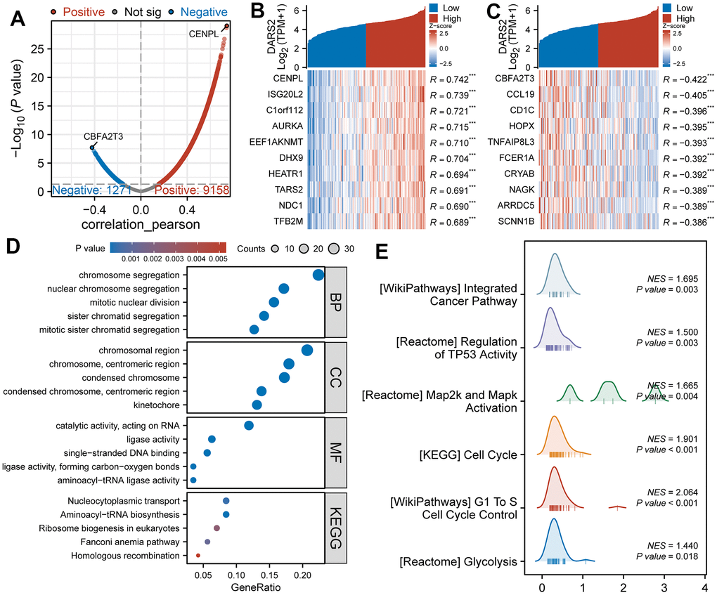 We performed Pearson correlation coefficient analysis to examine the correlation between DARS2 expression and other molecules in the TCGA ESCA dataset, specifically focusing on genes categorized as “coding proteins”. When selecting a threshold of p < 0.05, we identified a total of 9158 genes that showed a positive correlation with DARS2 expression, and 1271 genes that showed a negative correlation (Figure 3A). Among these genes, CENPL exhibited the highest positive correlation coefficient with DARS2, while CBFA2T3 exhibited the highest negative correlation coefficient. As illustrated in Figures 3B, 3C, the heatmaps were used to visually display the top 10 most significant genes positively and negatively correlated with DARS2 expression.