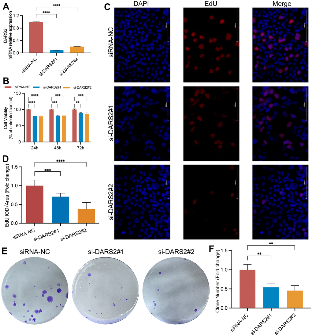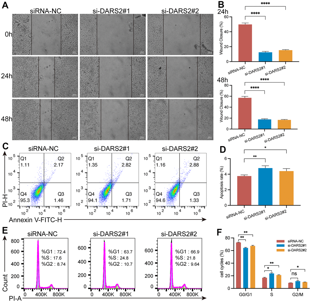 To verify the potential inhibitory effect of DARS2 knockdown on ESCA cells, we conducted a series of experiments in vitro. Firstly, we conducted qRT-PCR experiments, which showed that the mRNA expression level of DARS2 was significantly reduced after knockdown (Figure 4A, p < 0.05). Subsequently, we conducted CCK-8 experiments and EDU proliferation experiments to determine cell activity and cell survival rate. In the CCK-8 assay, the cellular viability of the DARS2 knockdown groups was significantly reduced compared to that of the control group (Figure 4B, p < 0.05). In the EDU proliferation experiment, the cell survival rates of the two si-DARS2 groups significantly decreased compared to the control group (Figure 4C, 4D, p < 0.05). Finally, we conducted colony formation experiments to further validate our hypothesis, and the results showed that knocking down DARS2 resulted in a decrease in cell proliferation ability (Figure 4E, 4F, p < 0.05). It has been further confirmed that inhibition of DARS2 expression can significantly suppress the proliferation of ESCA tumor cells. Next, we used wound healing to further verify that DARS2 inhibition can reduce cell migration. In wound healing measurements, knocking down the expression of DARS2 can significantly inhibit wound healing rate (Figure 5A, 5B, p < 0.05). Meanwhile, the results from flow cytometry demonstrated a noteworthy elevation in the quantity of apoptotic cells in both si-DARS2 experimental groups (Figure 5C, 5D, p < 0.05). Flow cytometry analysis revealed that compared to the control group, tumor cells in the experimental group were found to be arrested in the S phase and G2/M phase (Figure 5E, 5F, p < 0.05), suggesting that inhibition of DARS2 expression may disrupt the normal cell cycle progression in tumor cells.