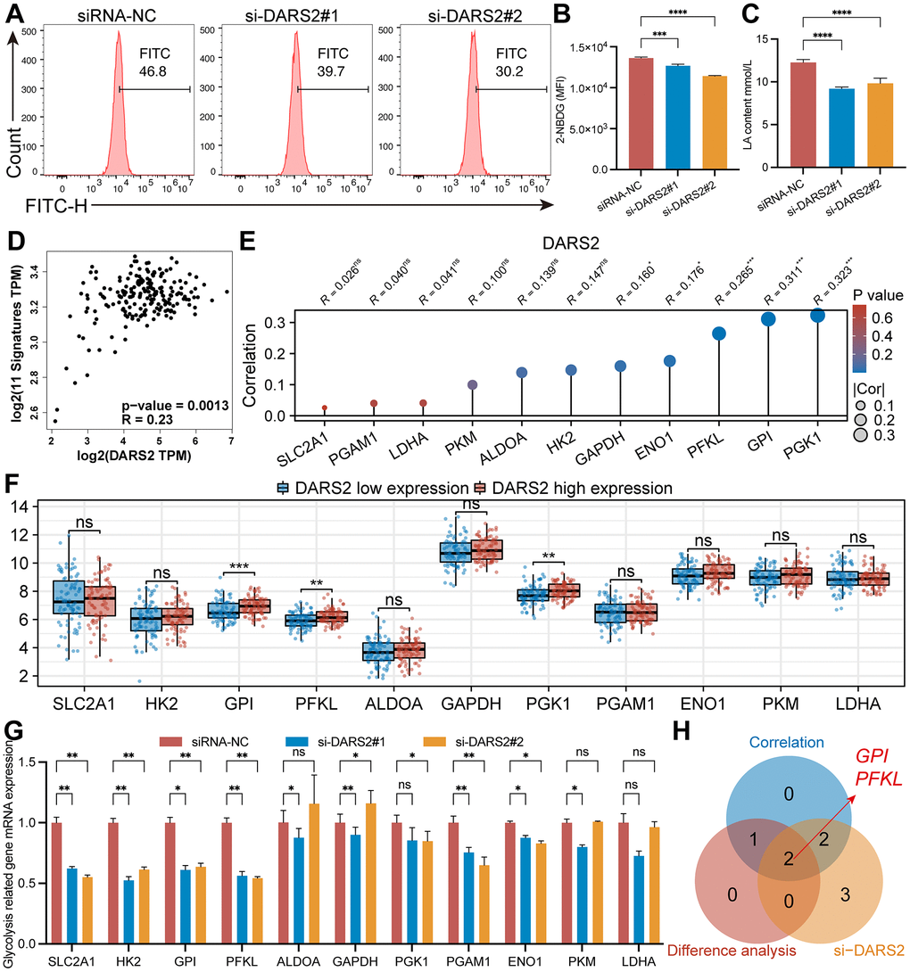 Previous GSEA analysis revealed enrichment of glycolysis-related pathways. Subsequently, glucose uptake experiments were conducted, indicating a decrease in glucose uptake capacity in the si-DARS2 groups compared to the control group (Figure 6A, 6B, p < 0.05). Furthermore, lactate production experiments demonstrated significantly lower lactate production in ESCA tumor cells after DARS2 interference (Figure 6C, p < 0.05). GEPIA online database analysis revealed that DARS2 expression was significantly positively correlated with glycolysis signatures in ESCA (Figure 6D, p < 0.05). To further explore the potential association between DARS2 expression and glycolysis, we analyzed the correlation between 11 glycolysis-related genes and DARS2 expression in the TCGA ESCA dataset. The results showed a positive correlation between DARS2 expression and five glycolysis-related genes, namely PGK1, GPI, PFKL, ENO1, and GAPDH (Figure 6E, p < 0.05). Additionally, based on DARS2 expression, we divided the TCGA ESCA dataset into high and low expression groups, further analysis revealed significantly higher expression of three glycolysis-related genes (PGK1, PFKL, and GPI) in the high DARS2 expression group compared to the low DARS2 expression group (Figure 6F, p < 0.05). Finally, qRT-PCR experiments were performed to examine the expression of 11 glycolysis-related genes in ESCA cells transfected with si-DARS2, which showed that SLC2A1, HK2, GPI, PFKL, PGAM1, and ENO1 genes were significantly lower in both si-DARS2 groups compared to the control group (Figure 6G, p < 0.05). However, ALDOA, GAPDH, PKG1, and PKM genes only showed a downward trend in one si-RNA group. Although the LDHA gene exhibited a downward trend in both si-DARS2 groups, no statistical difference was observed. The Venn diagram illustrates the genes that satisfy the aforementioned three conditions, including GPI and PFKL (Figure 6H).