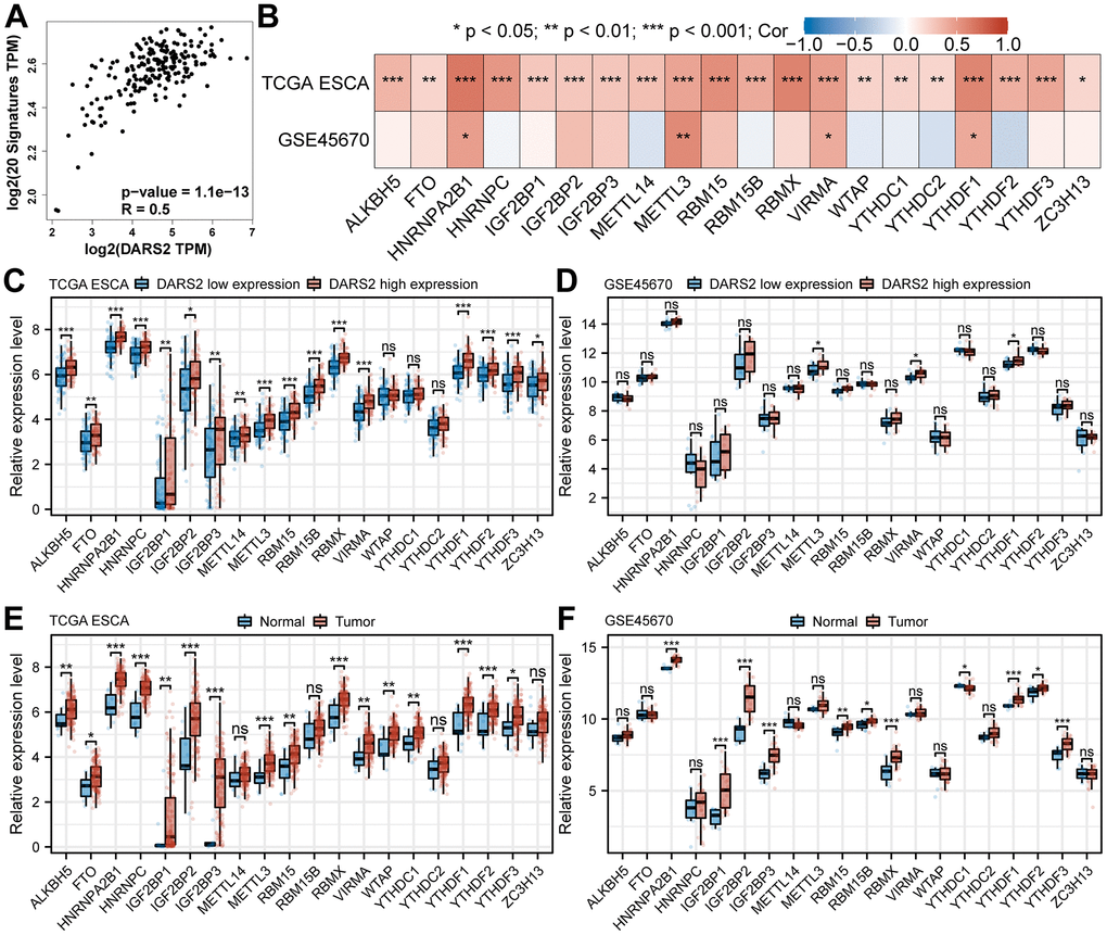 Studies have shown that m6A modification plays a significant role in the regulation of gene expression and signal transduction pathways in various types of tumors. GEPIA online database analysis revealed that DARS2 expression was significantly positively correlated with m6A signatures in ESCA (Figure 7A, p < 0.05). By analyzing the TCGA ESCA and GSE45670 datasets, we investigated the association between DARS2 expression and the expression of 20 m6A-related genes. The correlation analysis results demonstrated a significant positive correlation between DARS2 expression and HNRNPA2B1, METTL3, VIRMA, and YTHDF1 in both TCGA ESCA and GSE45670 datasets (Figure 7B, p < 0.05). Additionally, the expression of the other 16 genes was only significantly positively correlated with DARS2 in the TCGA ESCA dataset. Furthermore, based on the expression levels of DARS2, we divided the TCGA ESCA and GSE45670 datasets into high and low DARS2 expression groups, attempting to analyze the differential expression of m6A-related genes between the high and low DARS2 expression groups in ESCA samples. The results revealed that in the TCGA ESCA dataset, the expression of ALKBH5, FTO, HNRNPA2B1, HNRNPC, IGF2BP1, IGF2BP2, IGF2BP3, METTL14, METTL3, RBM15, RBM15B, RBMX, VIRMA, YTHDF1, YTHDF2, YTHDF3, and ZC3H13 was significantly higher in the high DARS2 expression group compared to the low DARS2 expression group (Figure 7C, p < 0.05). Similarly, in the GSE45670 dataset, the expression levels of METTL3, VIRMA, and YTHDF1 were significantly higher in the high DARS2 expression group compared to the low DARS2 expression group (Figure 7D, p < 0.05), consistent with the analysis results of the TCGA ESCA dataset. Finally, we further analyzed the expression differences of m6A-related genes between tumor samples and normal samples in the TCGA ESCA and GSE45670 datasets to demonstrate the impact of dysregulated expression of m6A-related genes on tumor progression. The results showed that in the TCGA ESCA dataset, compared to the normal group, there was a significant increase in the expression of 16 m6A-related genes in the tumor group, including ALKBH5, FTO, HNRNPA2B1, HNRNPC, IGF2BP1, IGF2BP2, IGF2BP3, METTL3, RBM15, RBMX, VIRMA, WTAP, YTHDC1, YTHDF1, YTHDF2, and YTHDF3 (Figure 7E, p < 0.05). In the GSE45670 dataset, compared to the normal group, there were 11 dysregulated m6A-related genes in the tumor group, including HNRNPA2B1, IGF2BP1, IGF2BP2, IGF2BP3, RBM15, RBM15B, RBMX, YTHDC1, YTHDF1, YTHDF2, and YTHDF3 (Figure 7F, p < 0.05).