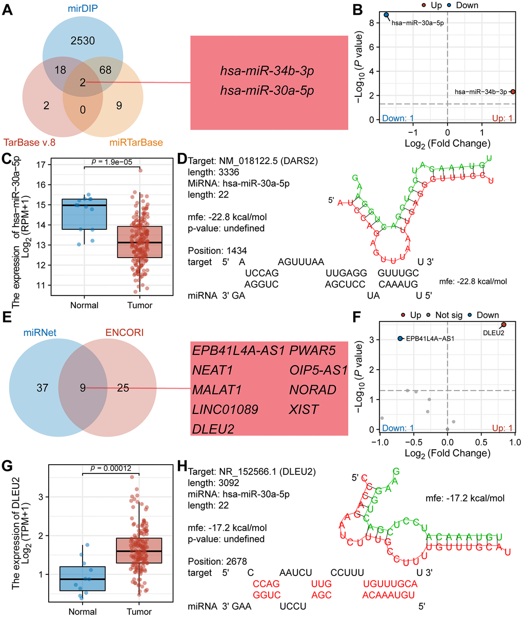 Research has shown that abnormal regulation of ceRNA networks may be involved in the occurrence and development of tumors. In this study, we predicted and constructed a ceRNA network associated with DARS2 in ESCA. Using TarBase v.8, mirDIP and miRTarBase databases, we predicted 22, 2618, and 79 miRNAs interacting with DARS2, respectively. The Venn diagram analysis revealed that two miRNAs, hsa-miR-34b-3p and hsa-miR-30a-5p, coexisted in all three databases (Figure 8A). Figure 8B showed the expression differences of hsa-miR-34b-3p (log2FC = 1.90, p = 0.005) and hsa-miR-30a-5p (log2FC = -1.78, p = 2.14E-09) in the TCGA ESCA dataset. According to the ceRNA hypothesis, when mRNA is overexpressed in tumors, corresponding miRNAs should be underexpressed. Therefore, we selected hsa-miR-30a-5p as the targeting miRNA for DARS2. Figure 8C displayed a significant decrease in the expression of hsa-miR-30a-5p in tumor samples compared to normal samples. By utilizing RNAHybrid for bioinformatics analysis, potential binding sites between DARS2 and hsa-miR-30a-5p were identified (Figure 8D). After analyzing the miRNet and ENCORI databases, we predicted 46 and 34 lncRNAs interacting with hsa-miR-30a-5p, respectively. Among them, 9 lncRNAs were found in both databases, namely EPB41L4A-AS1, PWAR5, NEAT1, OIP5-AS1, MALAT1, NORAD, LINC01089, XIST, and DLEU2 (Figure 8E). Differential analysis revealed that only 2 lncRNAs exhibited expression differences in the TCGA ESCA dataset, namely EPB41L4A-AS1 (log2FC = -0.70, p < 0.001) and DLEU2 (log2FC = 0.83, p < 0.001) (Figure 8F). Based on the ceRNA hypothesis, lncRNAs should be highly expressed in tumors when mRNA is overexpressed. Therefore, we selected DLEU2 as the target lncRNA for hsa-miR-30a-5p. Figure 8G demonstrated that the expression level of DLEU2 in tumor samples was significantly higher than that in normal samples. Bioinformatics analysis using RNAHybrid revealed potential binding sites between DLEU2 and hsa-miR-30a-5p (Figure 8H). These data suggest that DLEU2 may act as a competitive ceRNA binding to hsa-miR-30a-5p and promote the expression of DARS2. Our study provides new insights into the role of DARS2 and its ceRNA network in ESCA.