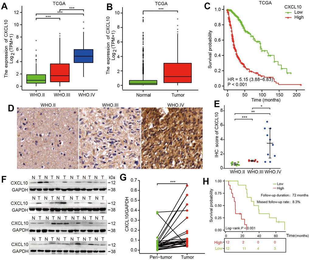 Our study evaluated the mRNA expression of CXCL10 using public data from The Cancer Genome Atlas (TCGA) and the GTEx database, as well as 24 pairs of glioma tissue samples. Analysis of the TCGA database revealed a significant increase in CXCL10 mRNA expression correlating with higher WHO glioma grades (Figure 1A). Additionally, CXCL10 levels were notably higher in glioma tissues compared to normal tissues (Figure 1B). High CXCL10 expression was associated with markedly poorer overall survival (OS) in patients (Figure 1C). Similarly, in our 24 paired human glioma samples, CXCL10 expression increased with glioma grades (Figure 1D, 1E and Supplementary Table 1) and was more pronounced in glioma than in adjacent normal brain tissues (Figure 1F, 1G). Patients with high CXCL10 expression also exhibited shorter survival periods (Figure 1H). These findings suggest a positive correlation between high CXCL10 expression and poor prognosis in glioma patients.
