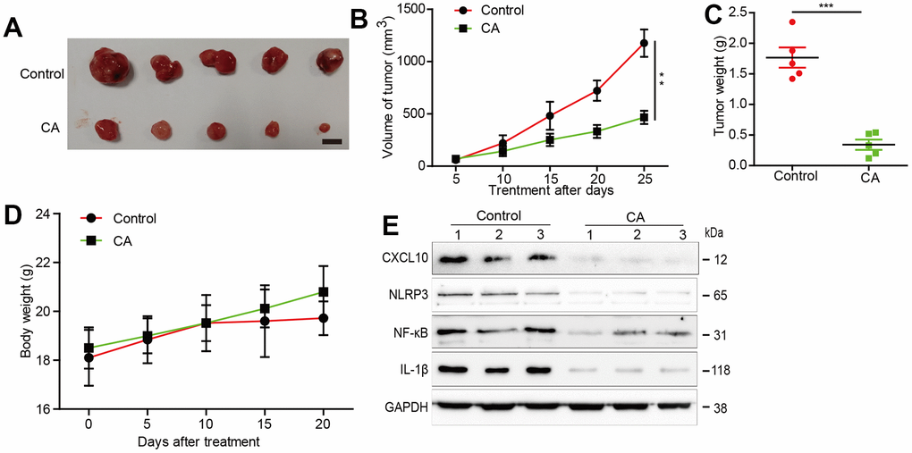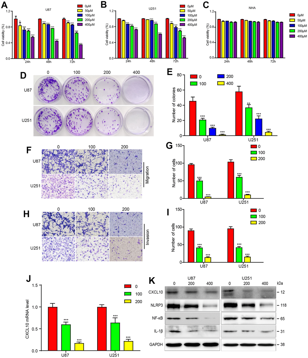 As CXCL10 is upregulated in GBM tissues and contributes to tumor progression and poor prognosis, inhibiting CXCL10 could be a viable treatment approach. Treatment with varying concentrations of CA downregulated CXCL10 expression at both mRNA and protein levels, reducing downstream molecules such as NLRP3, NF-κB, and IL-1β (Figure 2J, 2K).