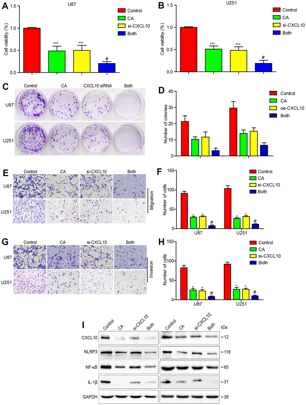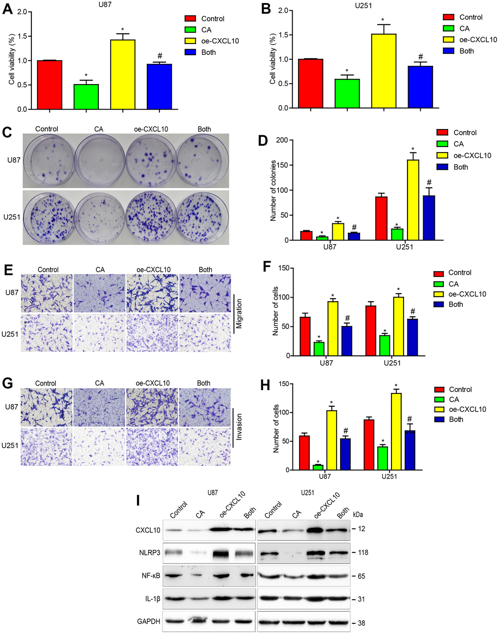 To determine if calycosin’s suppression of GBM cells is mediated through downregulating CXCL10, U87 and U251 cells were infected with a lentiviral vector carrying CXCL10 cDNA. Overexpression of CXCL10 enhanced cell proliferation, migration, and invasion, and reduced the inhibitory effects of CA (Figure 3A–3H). Overexpressed CXCL10 also promoted NLRP3, NF-κB, and IL-1β expression, countering the suppressive effects of calycosin treatment (Figure 3I).