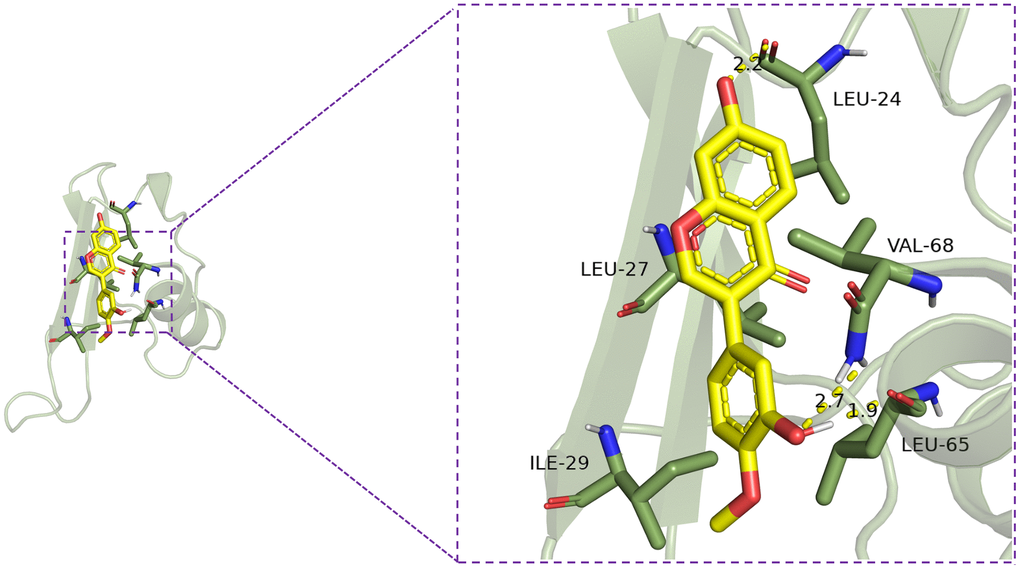 In order to evaluate the potential interaction between calycosin and CXCL10, we conducted molecular docking experiments. These experiments demonstrated that calycosin exhibits a notable binding affinity to CXCL10, characterized by a binding energy of -6.8 kcal/mol. The interaction is primarily mediated through the formation of hydrogen bonds with amino acids LEU-65, VAL-68, and LEU-24 (Figure 6). These findings indicate a stable binding conformation and suggest that calycosin may have an inhibitory effect on CXCL10 activity.