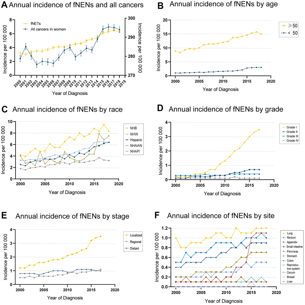 We used population data from the SEER program to calculate the age-adjusted incidence of fNENs per 100,000 individuals per year with a population of 2000 as the standard population. The age-adjusted incidence of fNENs increased from 3.2 to 6.3 per 100,000 from 2000 to 2018, with an APC of 4.5 (95%CI, 4.1-4.8) (Figure 1A). The increasing incidence of fNENs was found in all age groups, while the majority of fNENs patients (76.7%) were over 50 years old (Figure 1B). This upward trend was also observed in almost all race, grade, and stage groups, with the most noticeable increase in Hispanic (APC, 5.4; 95%CI, 4.7-6.1), Grade 1 (APC, 19.4; 95%CI, 17.6-21.3) and localized fNENs (APC, 6.6; 95%CI, 6.0-7.2) (Figure 1C–1E). With regard to the primary sites, fNENs diagnosed at lung, appendix, rectum, small intestine, pancreas, and stomach increased over time. The most remarkable increases were reported in appendix (APC, 19.3; 95%CI, 16.0-22.7), followed by pancreas (APC, 8.6; 95%CI, 7.7-9.6), stomach (APC, 6.3; 95%CI, 5.4-7.2), small intestine (APC, 4.5; 95%CI, 3.9-5), rectum (APC, 3.7; 95%CI, 2.9-4.5), and lung (APC, 1.8; 95%CI, 1.2-2.4) (Figure 1F).