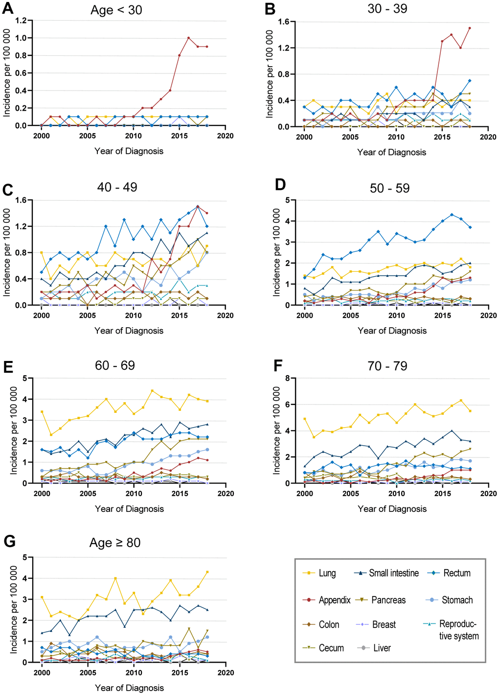 Due to the significant disparities of different ages and tumor sites, we programmed an in-depth analysis of the incidence of fNENs patients (Figure 2 and Supplementary Figure 2). The increasing incidence of fNENs was found in almost all age groups (Supplementary Figure 2A). In young fNENs (<40 years old), the overall incidence was low while appendiceal fNENs showed significant growth in the last 10 years (Figure 2A, 2B and Supplementary Figure 2F). Rectum fNENs played a dominant role in patients aged 40-59 years old, and pulmonary fNENs in patients over 60 years old (Figure 2C–2G).
