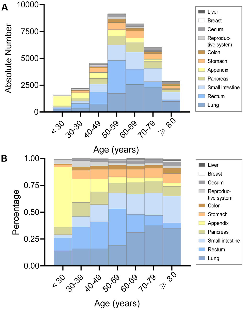 In terms of overall absolute number and percentage, the lung was the most frequent site of fNENs and was inclined to occur after 50 years old (Figure 3A). Similarly, the number of fNENs located in the stomach, small intestine, rectum, and pancreas had an abrupt growth after 50 years old (Figure 3A). The proportion of fNENs in different sites for each age group is presented in Figure 3B. The results also showed that fNENs of the appendix and female reproductive system have a higher proportion in young patients versus the elderly. Whereas the incidence of pulmonary and intestinal NENs was markedly higher among older than younger women.