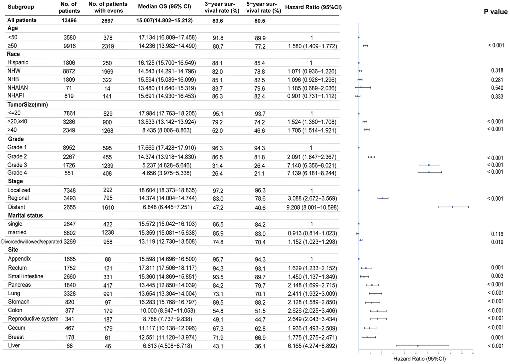 To identify the independent prognostic risk factors, we performed a multivariable analysis. The Cox proportional hazards regression model revealed that age, tumor size, grade, stage, and primary site were closely related to survival (Figure 4). Compared with the patients younger than 50 years old, the risk of death for the older was increased (HR, 1.58; 95%CI, 1.41-1.77). The prognosis was poorer for fNENs with G3 (HR, 7.14; 95%CI, 6.36-8.02) and G4 (HR, 7.14; 95%CI, 6.18-8.24) than for those with G1 and G2 (HR, 2.091; 95%CI, 1.85-2.37) after adjustment for other covariates. Overall survival was worse for patients with distant NENs (HR, 9.21; 95%CI, 8.00-10.60) than localized NENs. When we used appendiceal NENs as a reference, we observed that fNENs of other sites all had a higher risk of death. Among them, fNENs of small intestine (HR, 2.15, 95%CI, 1.70-2.72), pancreas (HR, 2.41; 95%CI, 1.93-3.01), lung (HR, 2.13, 95%CI, 1.59-2.85), stomach (HR, 2.63, 95%CI, 2.03-3.41), and colon (HR, 2.65; 95%CI, 2.04-3.43) had higher risk of death than appendiceal NENs, in which liver fNENs was the most dangerous (HR, 6.17; 95%CI, 4.27-8.89).