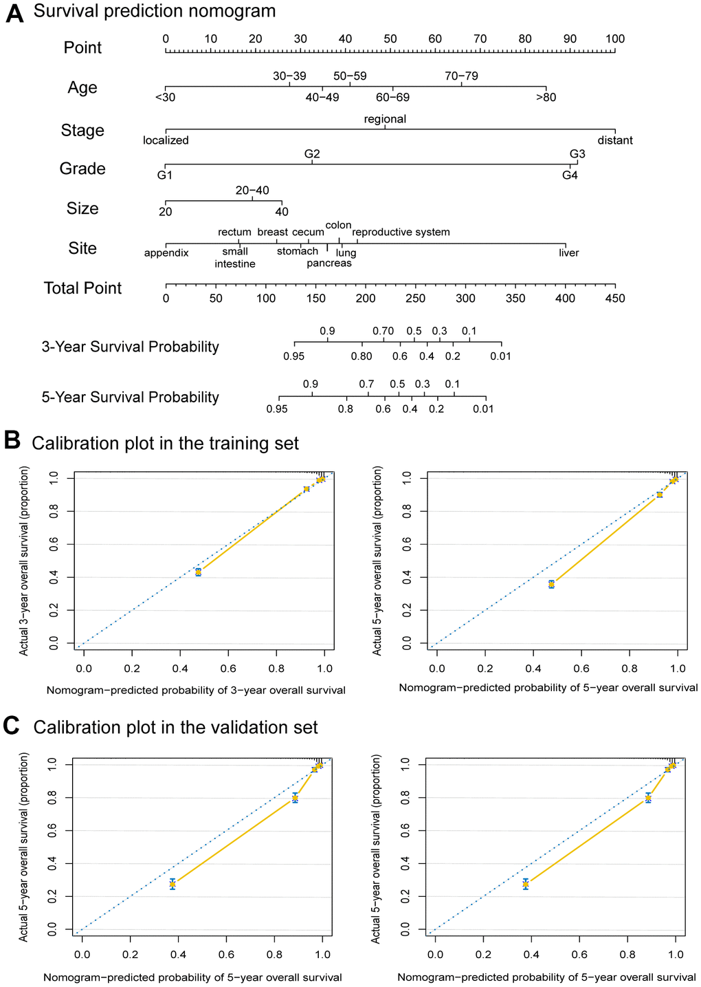 As reported, age, disease stage, grade, size, and primary tumor site were important predictors of survival outcomes [14, 15]. Our analyses did not observe a statistically significant difference in survival period among patients of different races and years of diagnosis, indicating better representativeness and applicability. Consistently, the disease stage had the greatest significance, contributing a maximum of 100 points. At the same time, age (85 points) and site (89 points) also had a great influence on survival, which was not observed in another nomogram whose age groups were simply divided [28]. More detailed division and higher weight of age made our nomogram model have higher predictive power [28, 29]. The need for precise analysis of clinical characteristics makes the use of more detailed age groups in large data-based studies a future research trend [24, 30]. As our nomogram’s good performance and high compatibility were confirmed, it will provide a preliminary assessment for patient stratification and precision therapy, which would be more helpful for practicing clinicians. However, the treatments were not contained in the prognostic model because of the limitation of the database. The treatments for NENs include somatostatin analogue therapy, molecularly targeted agents (for example, everolimus and sunitinib), peptide receptor radionuclide therapy with Lutetium-177 DOTA-TATE (177Lu PRRT), chemotherapy, and surgery, which were not as detailed as we wished in it [5]. Despite all this, our nomograms still show a high accuracy, which could provide a preliminary prognostic evaluation for fNENs patients.