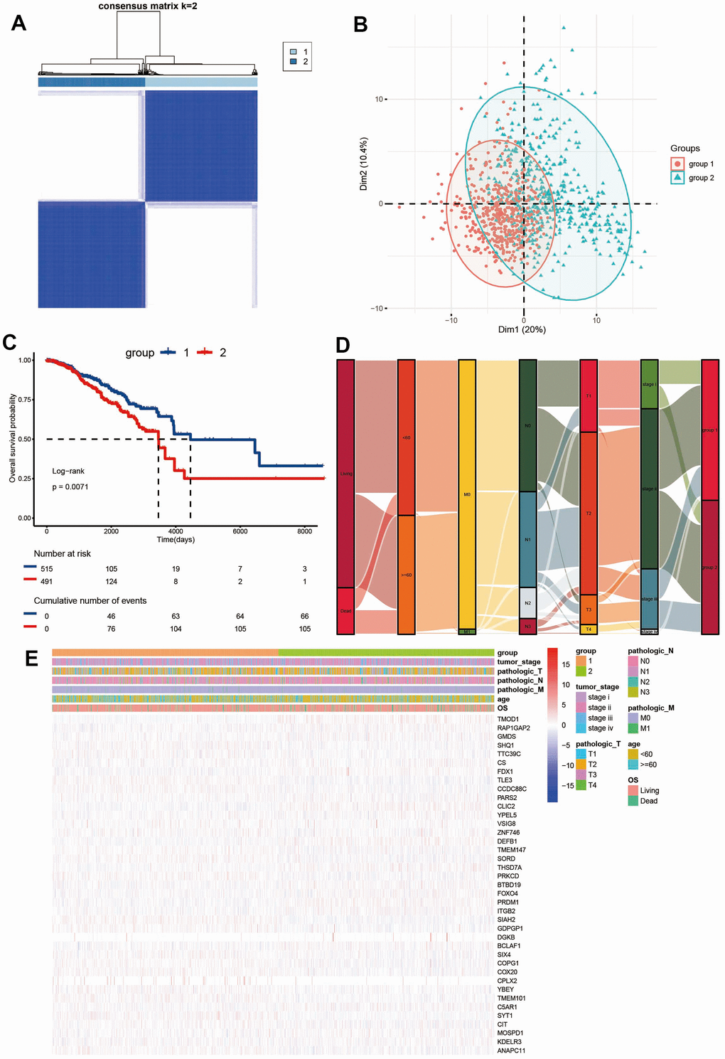 The unsupervised clustering ‘Pam’ method was applied to the identification of different molecular subtypes based on survival-related ADCP gene expression [11]. The R package Consensus Cluster Plus performs this process and determines the number of clusters in Queue A, with 1000 times repeated to make sure classification stability [12]. Principal component analysis (PCA) was employed to illustrate the distribution differences. To evaluate the clinical significance of ADCP subtypes, their relationship with prognosis and other clinicopathological features (including age, stage and cancer subtypes) were examined. In different cohorts, the overall survival (OS) of different clusters was compared using the Kaplan-Meier (K-M) survival chart, with P ≤ 0.05 indicating statistical significance. Besides, the relationship between ADCP subtypes and other clinical variables was visualized using the Sankey plot and drawn using the ggalluvial R package [13]. The heat maps of different ADCP gene expression patterns were plotted by the pheatmap R package [14].