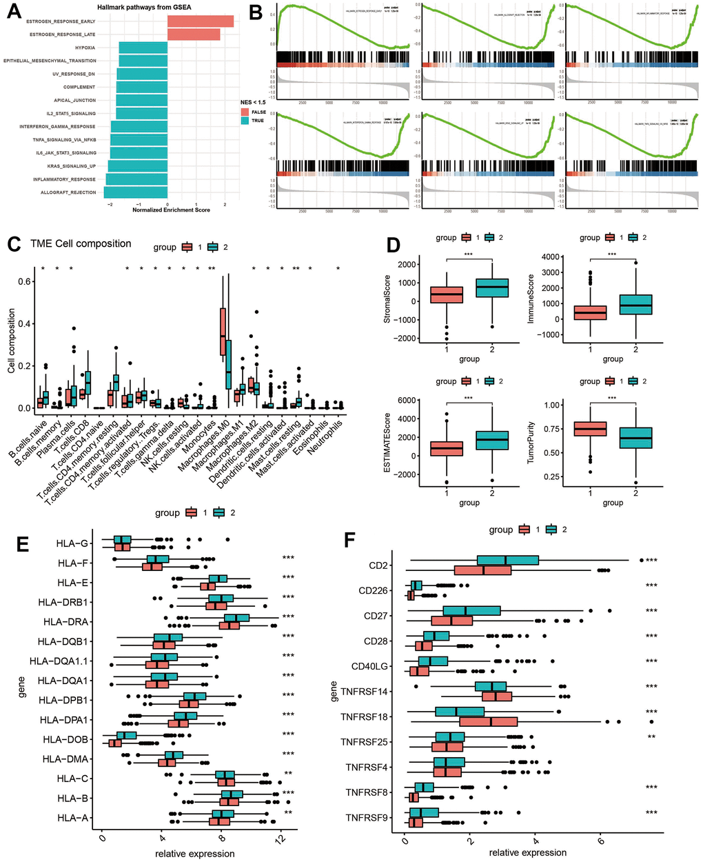To explore the disparity in pathway enrichment analysis between the two clusters of ADCP in cohort A, GSEA was performed, with different immune infiltration patterns identified within the two subtypes. The enrichment histogram showed that cluster 1 significantly enriched hormone metabolism (including early estrogen response, late estrogen response) and inflammatory signal regulation pathways (allograft rejection, inflammatory response, kras signal and il6 jak stat3 signal, tnfa signal conduction through NFKB) (Figure 2A). At the same time, GSEA confirmed that there were differences in the immune pathways of ADCP clusters. The results showed that DEGs with higher expression levels in cluster 1 were significantly enriched in early estrogen response, allograft rejection pathway, inflammatory response, interferon response, kras signaling pathway and tnfa signal transduction through NFKB (Figure 2B). Given the strong correlation between ADCP subtypes and immune activity, the TME of the two clusters in cohort A was investigated (Figure 2C). Cluster 1 subtype is featured with high infiltration of Natural Kill cells (resting) and Macrophages, while cluster 2 subtype exhibits elevated infiltration levels of B cells, Plasma cells, T cells, Natural Kill cells, Dendritic cells, Mast cells and Neutrophils. Based on TCGA expression profile, the stromal score, immune score as well as ESTIMATE score of malignant tumor tissues were calculated through ESTIMATE algorithm. ESTIMATE produces a matrix score that measures the presence of tumor-associated matrices, as well as an immune score that reflects the level of immune cell infiltration. These scores are combined to produce an index called an ‘estimated score’ which provides a comprehensively estimation tumor purity. Compared with cluster 1, samples in cluster 2 also showed significantly higher estimated scores (Wilcoxon test, P < 0.05, Figure 2D). This trend was also observed for matrix scores as well as immune scores (Wilcoxon test, P < 0.05). Additionally, we studied the association between the two subtypes and major histocompatibility complex (MHC) and T cell stimulators. In addition to HLA-C, the expression levels of MHC as well as T cell stimulators exhibited a tendency to be higher in cluster 2 (Figure 3E, 3F).