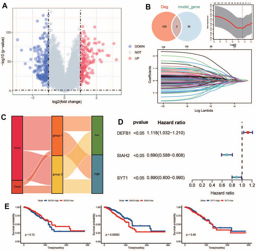 Using the limma algorithm, a total of 432 degs (Differentially expressed gene) between group1 and group2 are identified under the filtering threshold of FDR q-value < 0.01 and the absolute value of logFC > 1 (Figure 3A and Supplementary Table 2). Prognostic models were constructed for 1006 BC patients with OS information in cohort A. LASSO Cox regression analysis was utilized to determine the best prognostic features based on 130 survival-related ADCP genes. After the variables were included in the LASSO Cox regression model with the smallest lambda, the genes of 39 ADCP-related features were chosen to construct the ADCP-related risk scoring model. Three key ADCP genes (DEFB1, SIAH2 and SYT1) by overlapped DEGs from cohort A and the model ADCP genes were identified (Figure 3B). The relationship of the expression levels with 3 ADCP-related signatures together with OS are also presented in the forest plot (Figure 3D). The expression of three key ADCP genes is of significance for survival (Figure 3E).