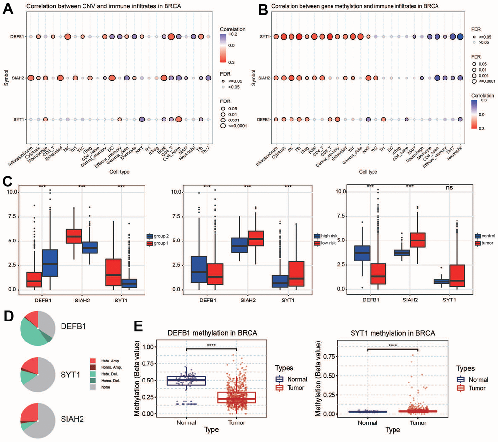 We studied the relationship of CNV with immune infiltration in BRCA. Additionally, we explored the association of gene methylation with immune infiltration. CNV and methylation of key ADCP genes were closely associated with the infiltration of key immune cells including T and B cells (Figure 4A, 4B). At the same time, based on cohort A, the gene expression levels of 3 key ADCP genes were analyzed. In the data set, only DEFB1 was down-regulated in group1, while SIAH2 and SYT1 were up-regulated in group2 (Wilcoxon test, P > 0.05). Only DEFB1 was up-regulated in the high-risk group, while in the low-risk group, SIAH2 together with SYT1 were down-regulated (Wilcoxon test, P > 0.05). Only DEFB1 was up-regulated in the tumor group; in contrast, SIAH2 and SYT1 were down-regulated in the low-risk group (Wilcoxon test, P > 0.05, Figure 4C). Among the three key ADCP genes, the frequency of copy number alterations (CNA) of SIAH2 was higher compared to that of the others. Specifically, CNA deletions were predominant among all types (Figure 4D). Methylation analysis showed that the beta value of SIAH2 was higher in the tumor group than in the normal group, and DEFB1 was the opposite (Figure 4E). It is well known that gene expression is negatively correlated with the level of methylation, while CNA has a positive effect on gene expression. In summary, CNA and methylation may be may be important in the up-regulation of SYT1 expression in BC.