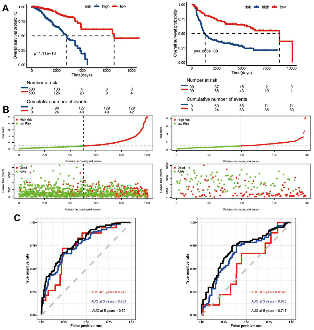 For each patient, the risk score was predicted by the ‘predict’ function in the survival R package [20]. Patients were then divided into high- and low-risk groups according to the median value. To test the accuracy of the Cox regression model, C-indexes as well as receiver operating characteristic curves (ROC) were adopted. Prognostic factors, including C-indexes representing risk score, were visualized using histogram. ROC analysis was performed by the ‘pROC’ package [21], with the area under the curve (AUC) values calculated and compared to evaluate the performance of the model. In addition, the K-M survival analyses were conducted for risk scores. Based on training and test datasets, 1-, 3- and 5-year ROC curve were plotted using the R package timeROC [22].