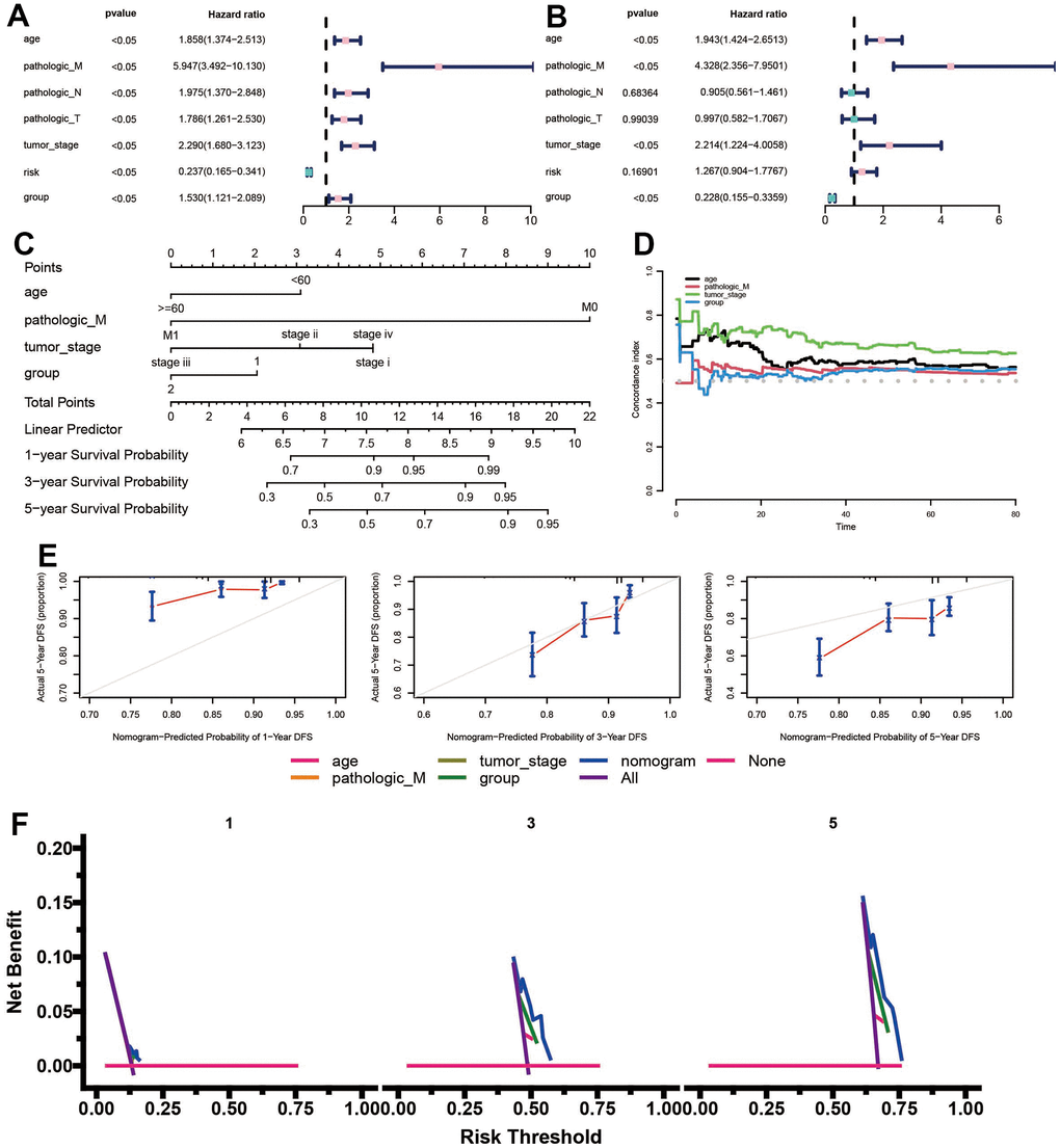 Since ADCP genes are significantly associated with high malignancy and advanced tumors of BC, univariate and multivariate Cox regression analysis were carried out to determine the prognostic significance of ADCP genes for BC patients. ADCP group, age, TNM stage, stage together with risk score were included as covariates. Results showed that ADCP group, age, TNM stage, stage as well as risk score were independent prognostic factors for BC patients (Figure 6A, 6B). we constructed a nomogram by combining independent prognostic factors, serving as a clinically relevant quantitative method tool for predicting the mortality of individual BC patient (Figure 6C). Based on the c-exponential curve of different variables over time in the TCGA cohort, nomogram performed best compared to other single factors (Figure 6D). Add up the scores of each prognostic parameter and assign a total score to each patient. The higher the total score, the worse the prognosis of patients. The modal diagram has similar performance to the ideal model (Figure 6E). In addition, the DCA curve also indicated that the nomogram had good stability and reliability net benefit curve in age compared with other clinical factors (Figure 6F).