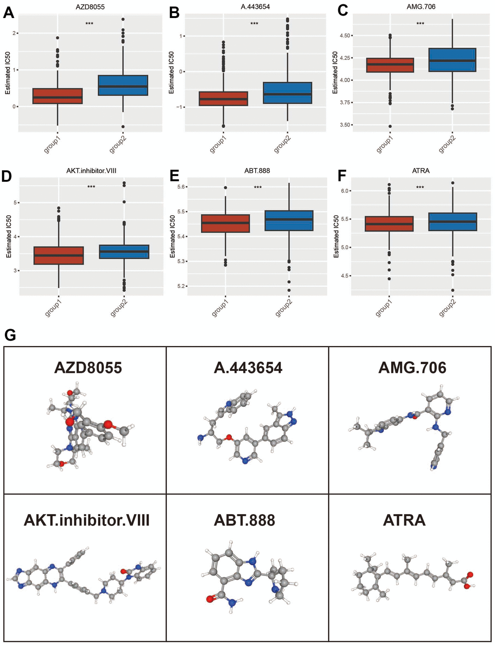 We evaluated the chemotherapy response and drug resistance of patients in the ADCP group. Figure 7 shows the sensitivity of two ADCP subtypes to six anticancer drugs (AZD8055, A.443654, AMG.706, AKT.inhibitor.VIII, ABT.888, ATRA). Results showed that the IC50 level of group2 was higher compared to group1 (Figure 7A–7F), and small molecule drugs with therapeutic effects on BC could be found according to the results of drug sensitivity. Three-dimensional structural tomography of AZD8055, A.443654, AMG.706, AKT.inhibitor.VIII, ABT.888 and ATRA was found in PubChem (Figure 7G).