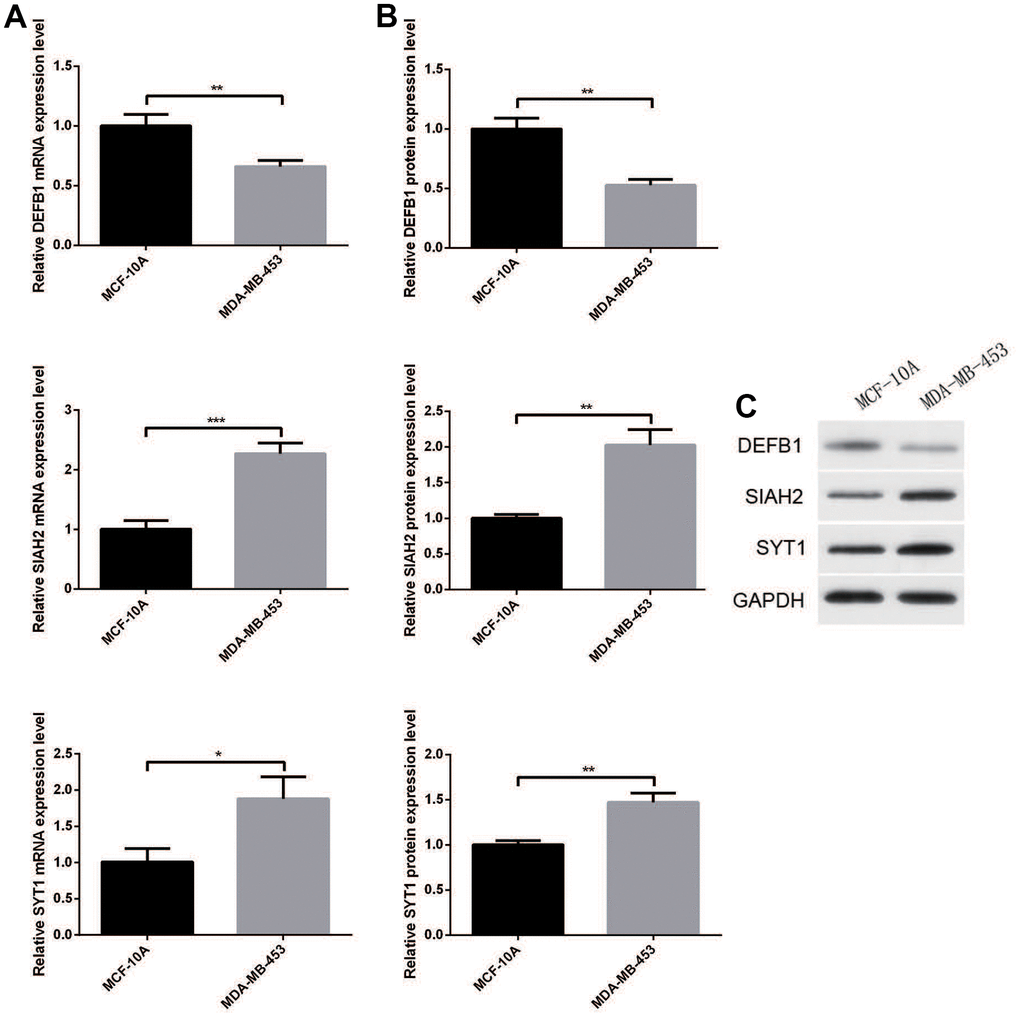 We verified the mRNA and protein levels of DEFB1, SIAH2 and SYT1 in BC cell lines and adjacent cell lines by qRT-PCR and WB. Results of qRT-PCR is shown in Figure 8A. In contrast with the normal control, DEFB1 level in BC cell line MDA-MB-453 was lower, but the SIAH2 and SYT1 levels were higher. The protein expression levels of the three key ADCP-genes based on WB analysis were consistent with the results of qRT-PCR experiments (Figure 8B, 8C).