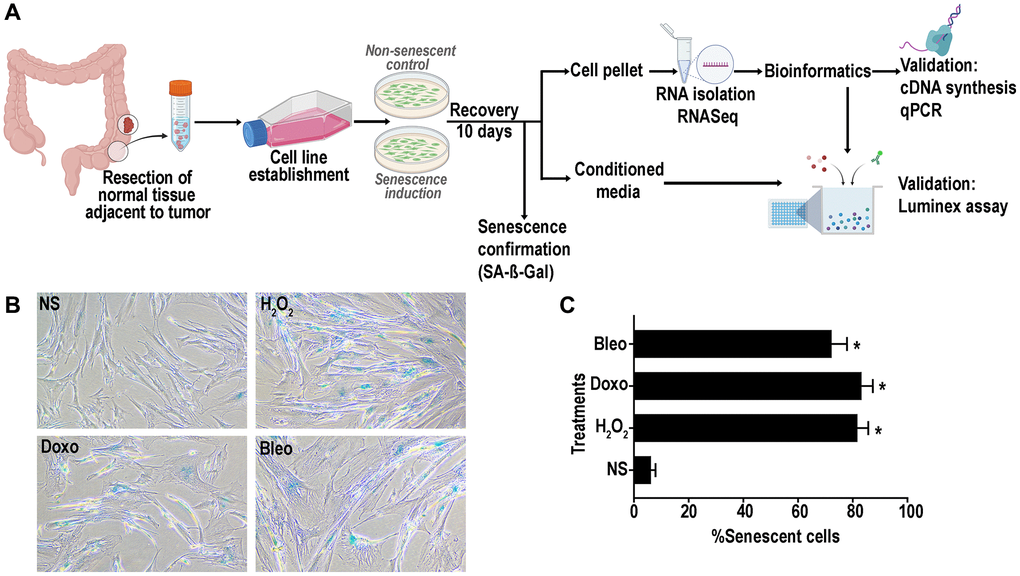 We established 7 lines of primary human colon fibroblasts from resected normal healthy rectosigmoid colon from subjects with concurrent colon cancer. To induce senescence using genotoxic and oxidative stressors, we selected three different agents: doxorubicin, bleomycin and hydrogen peroxide as they induce senescence through different mechanisms: DNA alkylation and double-strand breakage; thymidine incorporation inhibition and single and double-strand DNA breakage; and oxidative stress, respectively. In addition, it is well known that the human colon mucosa is subject to exposure to alkylating and methylating agents and to oxidative stress making these agents physiologically relevant [37, 38]. A schematic representation of the overall study plan is described in Figure 1A. Following recovery for around 10 days from treatment initiation, cells displayed classic senescence features including flattened and enlarged morphology. Positive senescence associated Beta-galactosidase (SA-β-gal) activity at pH 6 (Figure 1B) was confirmed in more than 70% of the treated cells (Figure 1C) versus non-treated, proliferating control cell (hereon referred to as non-senescent (NS) controls).