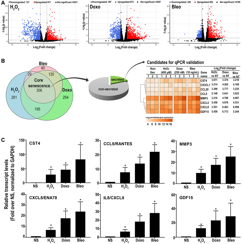 RNAseq analysis was performed on three patient-derived fibroblast lines using the HiSeq platform. Transcripts were analyzed for differential expression in senescent cells versus proliferating control cells using stringent criteria (FDR ≤0.01 and log2(fold change compared to NS) ≥ or ≤1). Out of 15,569 detected transcripts, several differentially regulated transcripts associated with inducer-specific senescence were found: 1538 transcripts in hydrogen peroxide-induced samples, 1492 in doxorubicin-induced samples, and 780 in bleomycin-induced samples. (Figure 2A). A Venn diagram (Figure 2B) was used to identify senescence-associated genes common to all methods of induction and is here-on referred to as the ‘core senescent profile’. The complete list of differentially expressed genes in the core senescent profile is provided in Supplementary Table 2. As a secondary confirmation of senescence, we assessed the expression of known markers of senescence and identified elevated CDKN1A/p21Cip1 and CDKN2A/p16Ink4a, and decreased LMNB1 transcripts levels compared to the NS group (Supplementary Figure 1). Since the intent of the study was to identify genes that may contribute to the colon SASP, our further analyses focused on transcripts that are up-regulated with senescence.